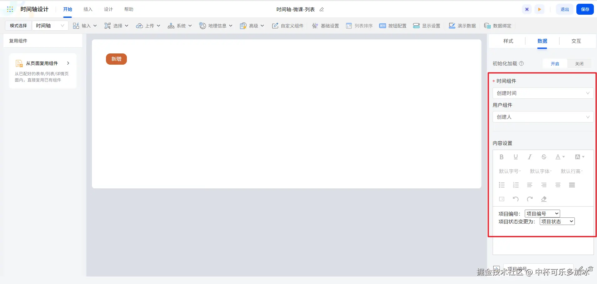 倘若我们需要记录项目随时间推进而产生的状态变更记录,时间轴组件会更加合适。进入到时间轴组件的配置页,首先插入相关字段,然后绑定时间字段,确保记录与时间紧密关联,最后设定展示信息。