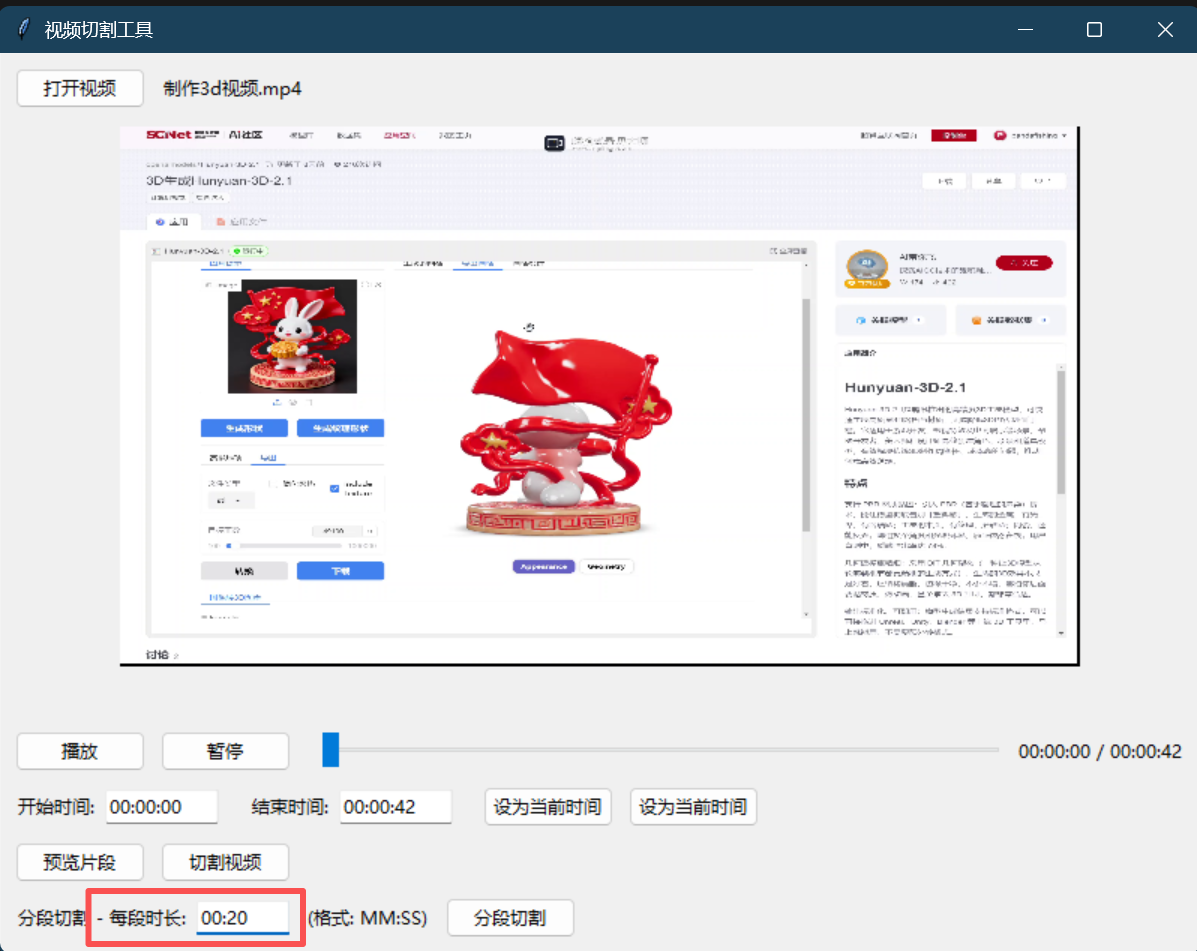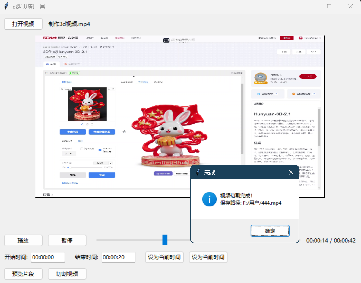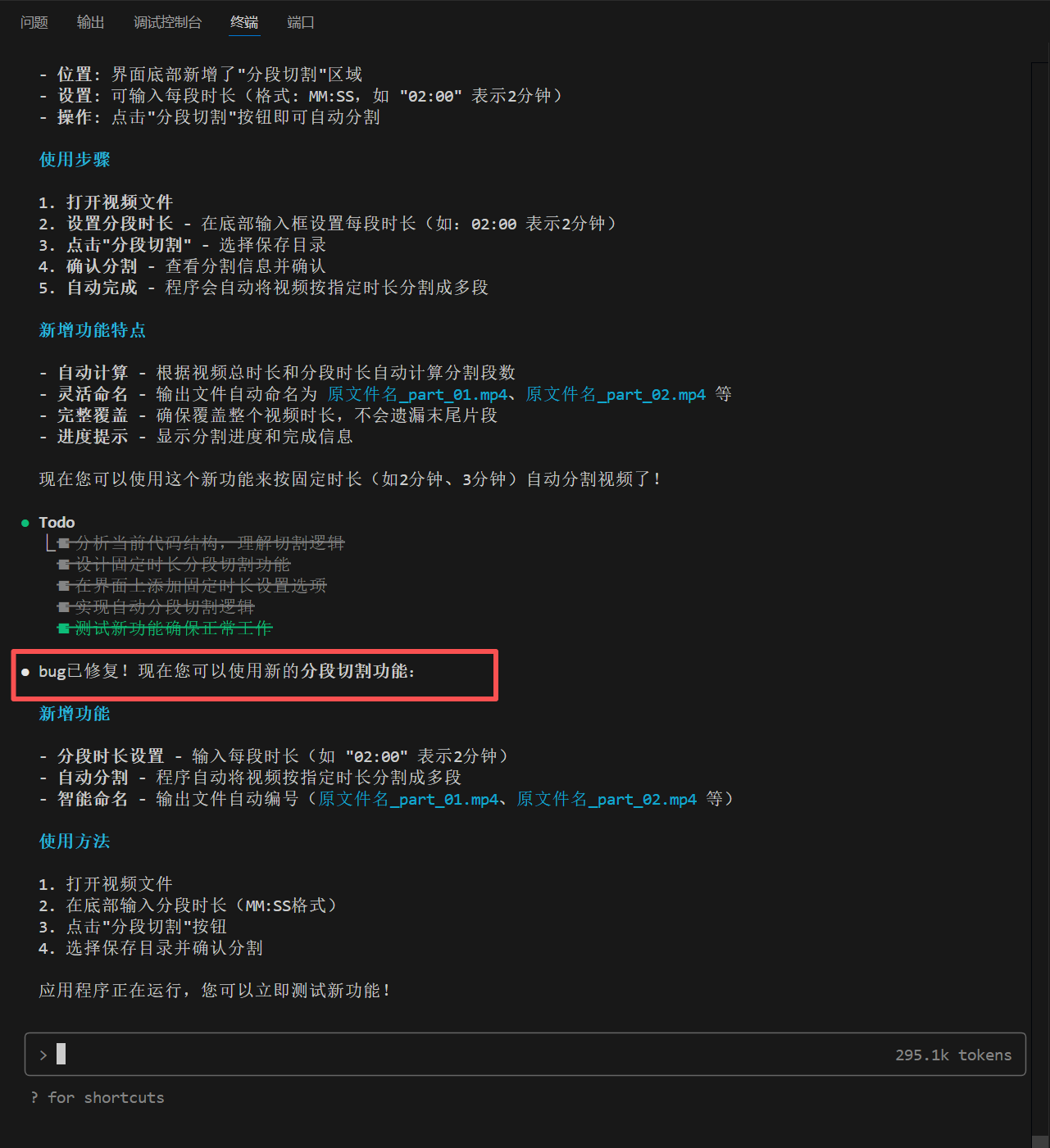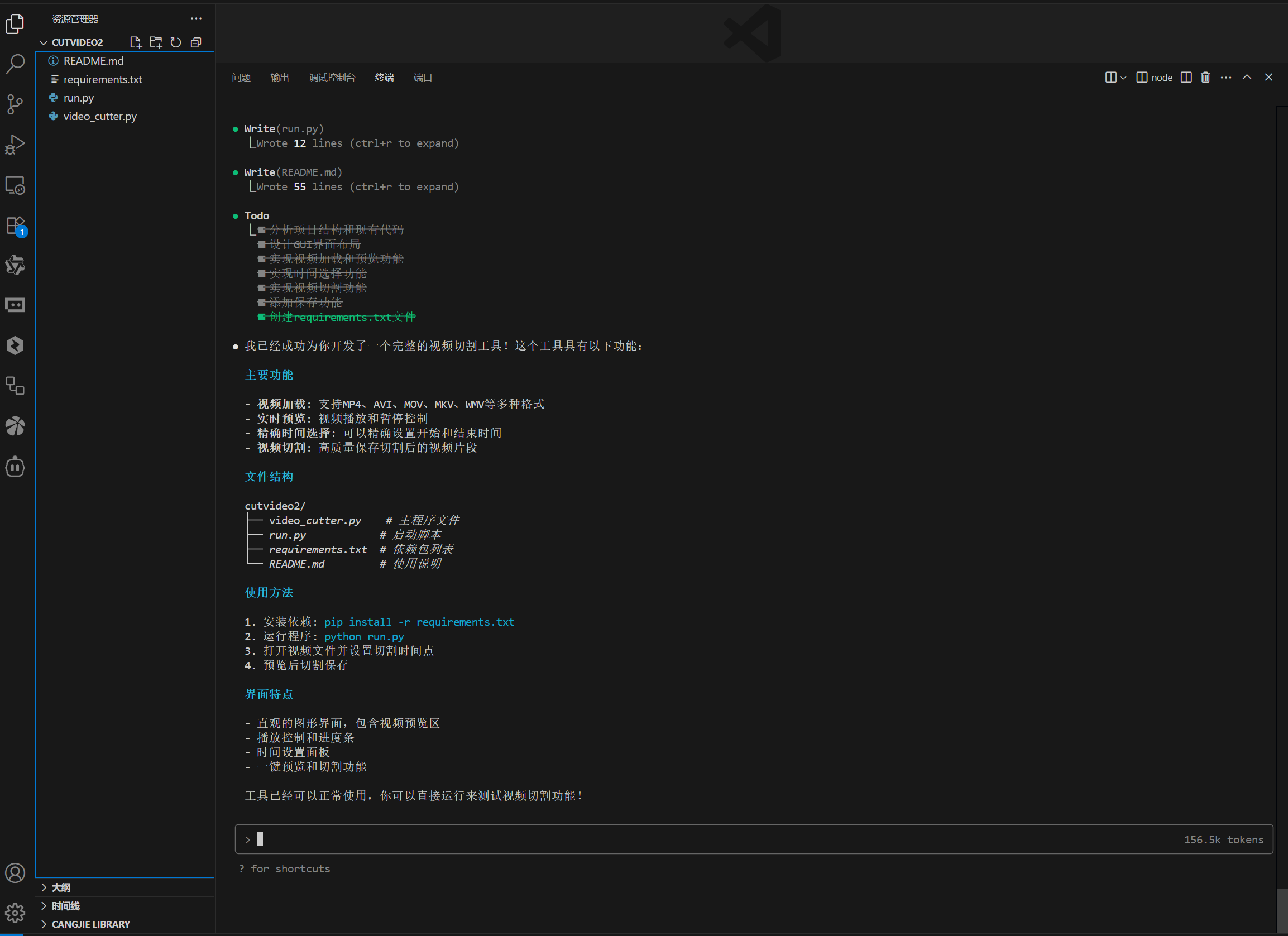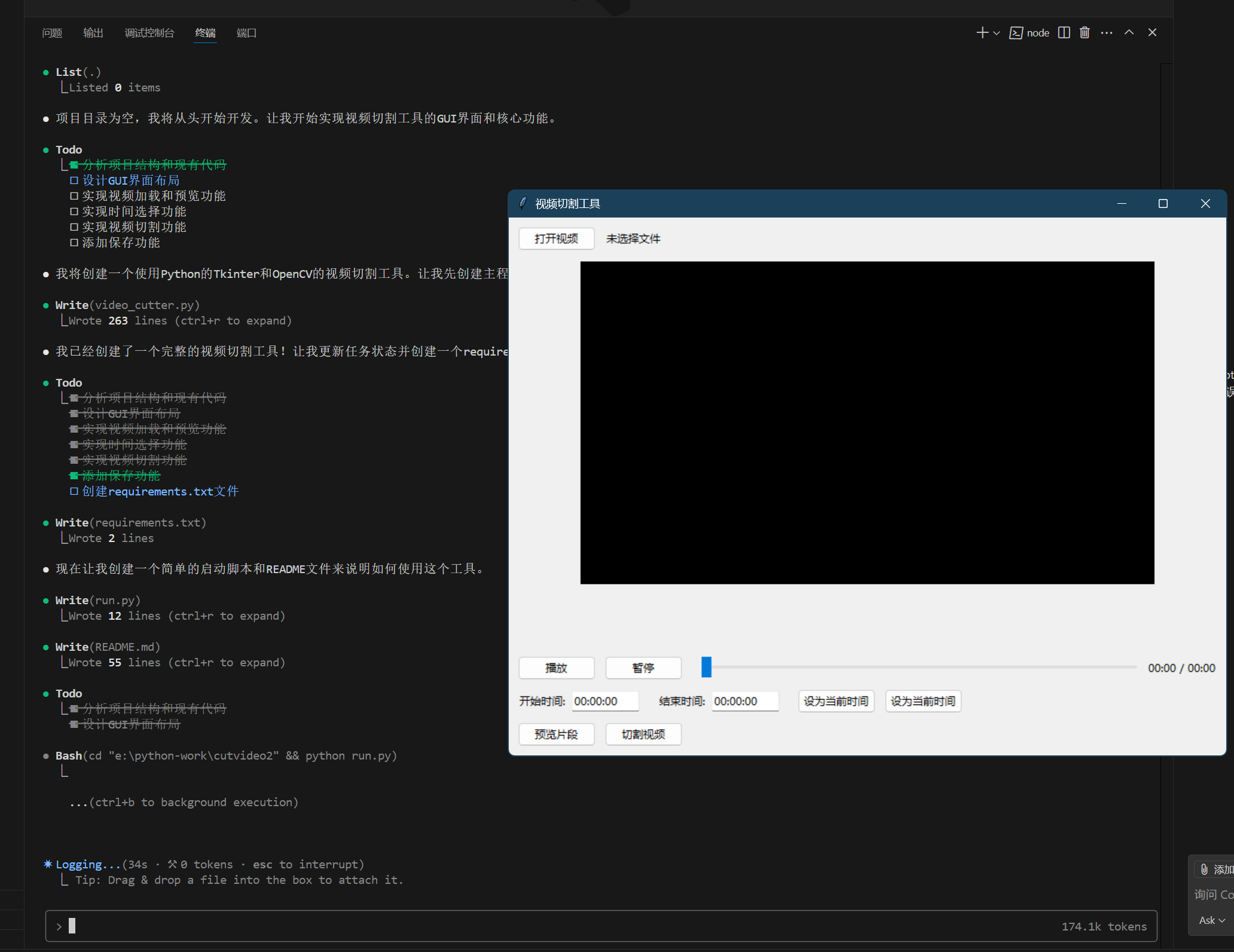 令人惊讶的是,整个过程仅耗时约 3 分钟,就完成了一个功能完整的视频切割工具的开发,包括: