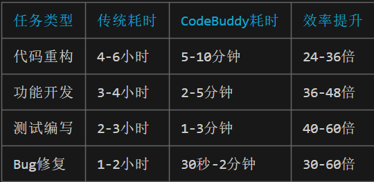 总体而言,CodeBuddy Code CLI在标准编程任务上可实现30-60倍的效率提升,在重复性、模式化任务上甚至能达到100倍以上的效率提升。