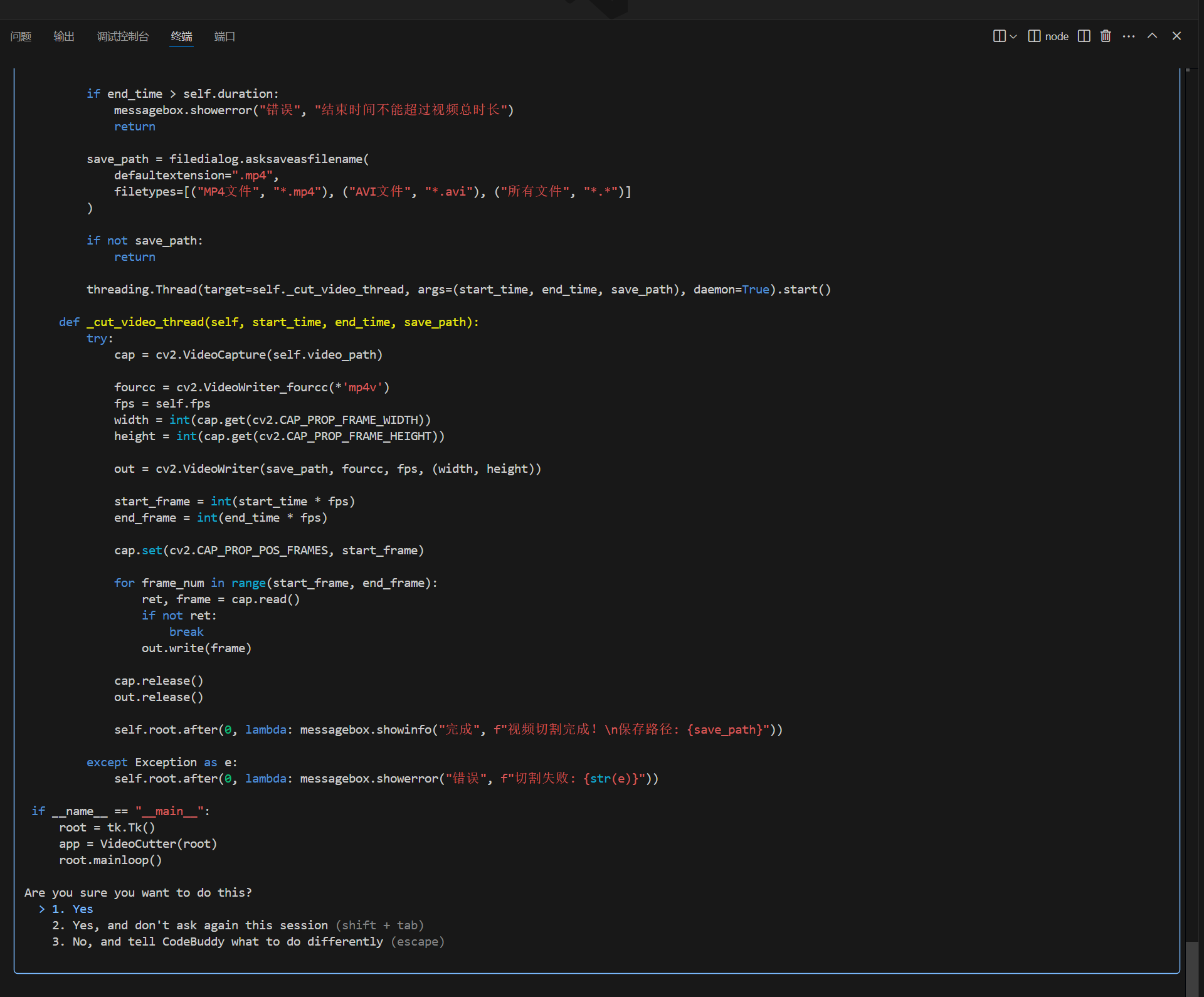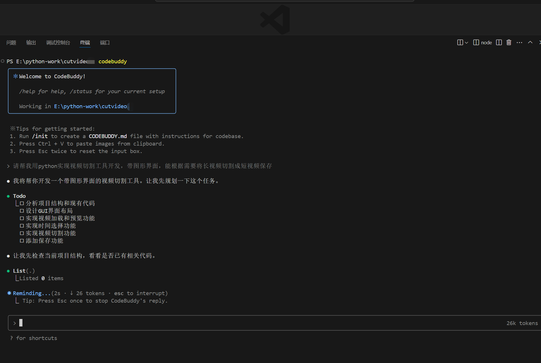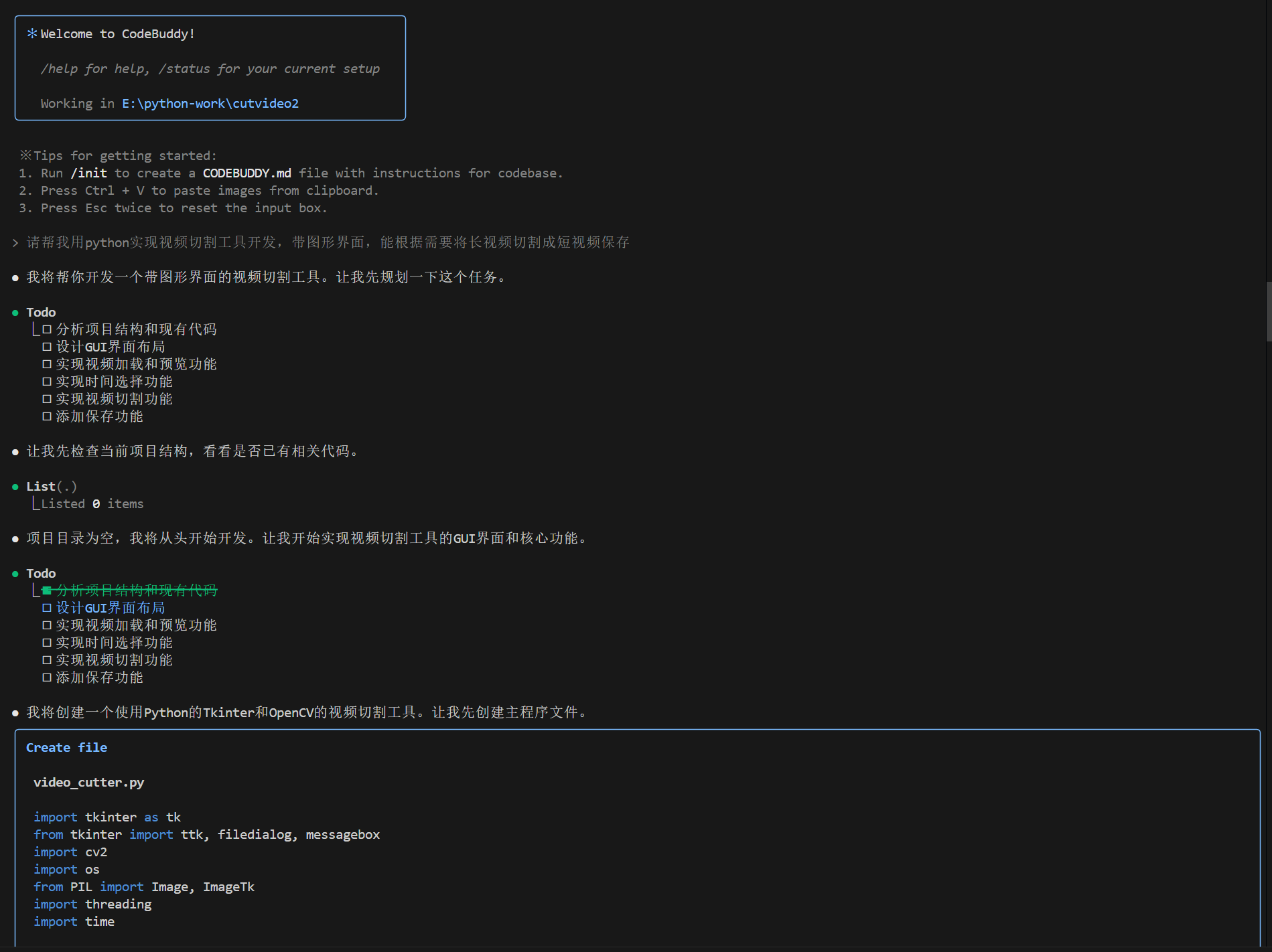 在我们的测试中,我们尝试使用 CodeBuddy CLI 开发一个视频切割工具。整个过程如下: