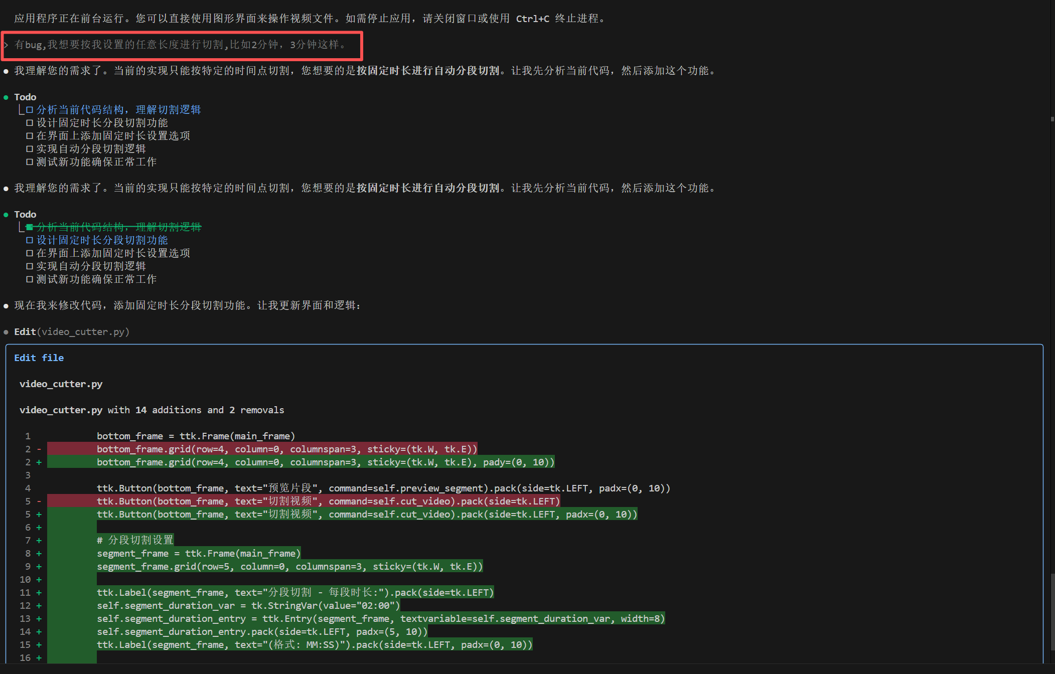 我告诉它:有bug,我想要按我设置的任意长度进行切割,比如2分钟,3分钟这样。