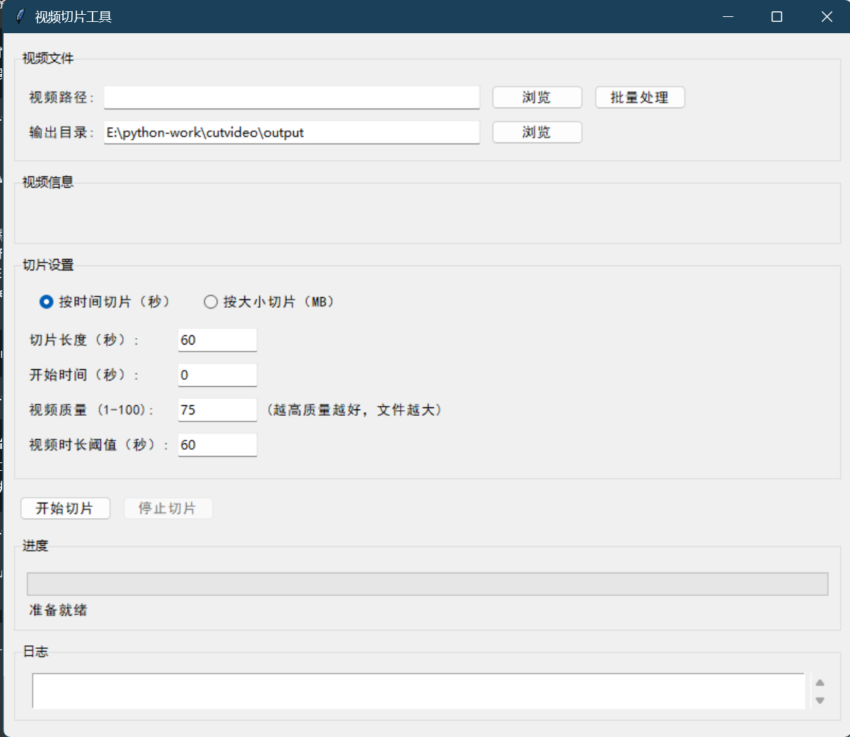本项目是一个基于Python + Tkinter的图形界面视频切割工具,能够将长视频按照指定时间点切割成短视频片段保存。