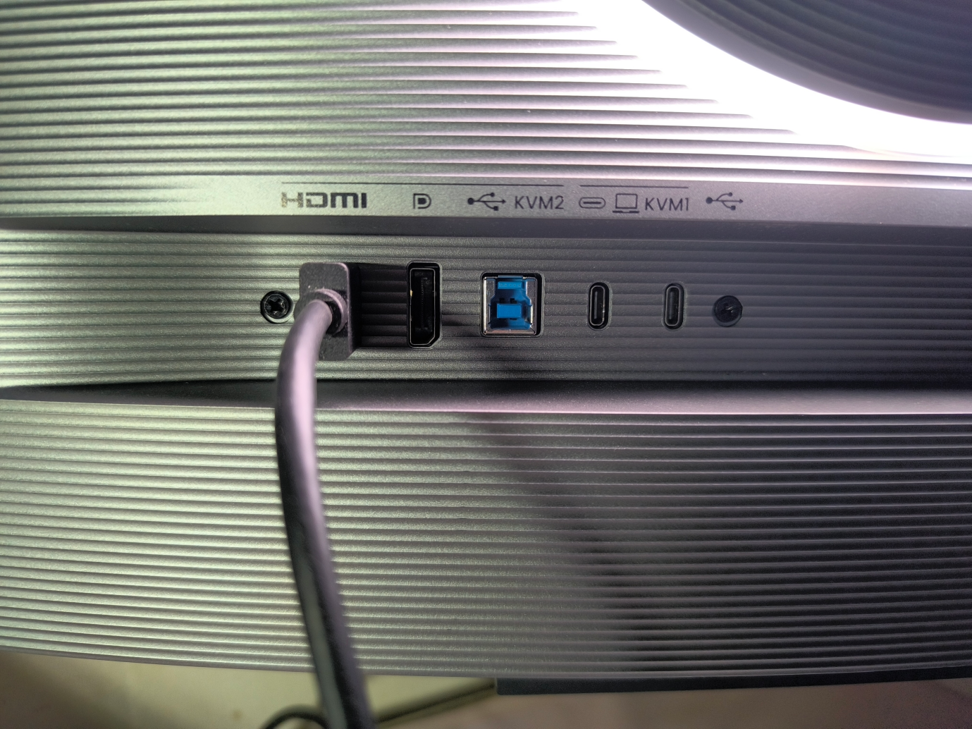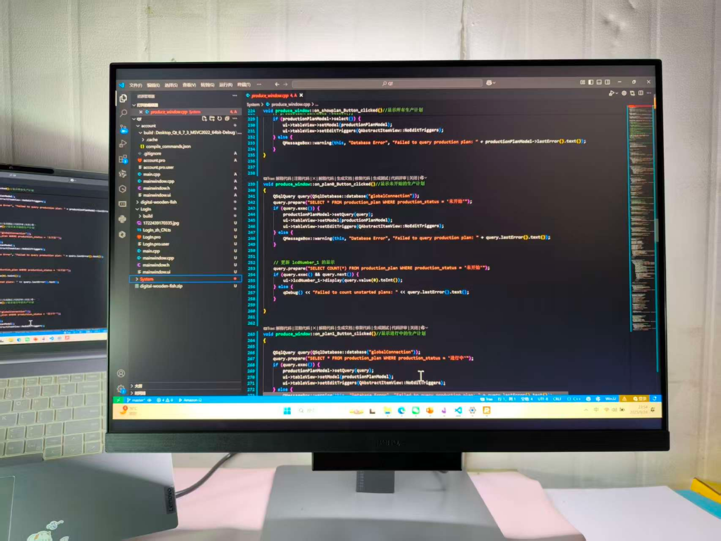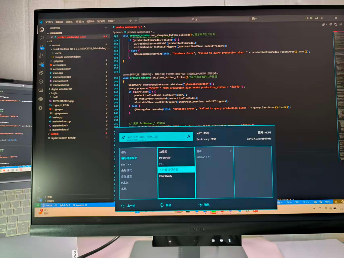 用一根 USB-C 线连笔记本,USB-B 线连台式机,键盘鼠标插显示器的 USB 下行口 ——KVM 切换让我用一套外设控制两台电脑。写好接口代码(笔记本),按一下 KVM 键,直接用同一套键鼠在台式机的服务里看运行效果(参数是否正确解析),不用起身换设备,思路丝滑到底。