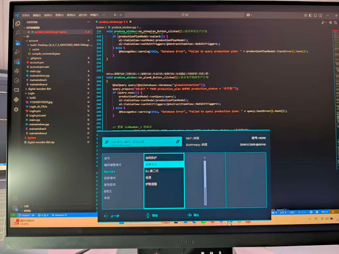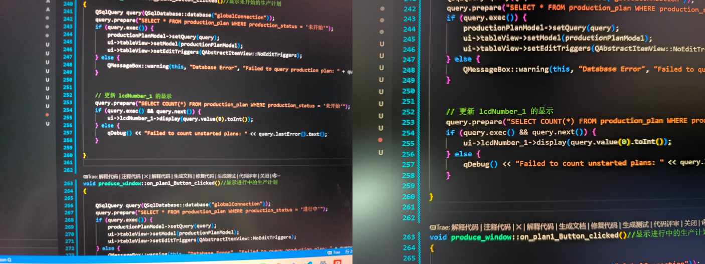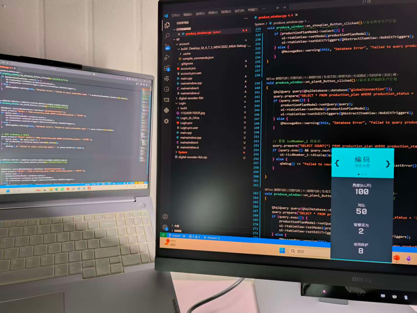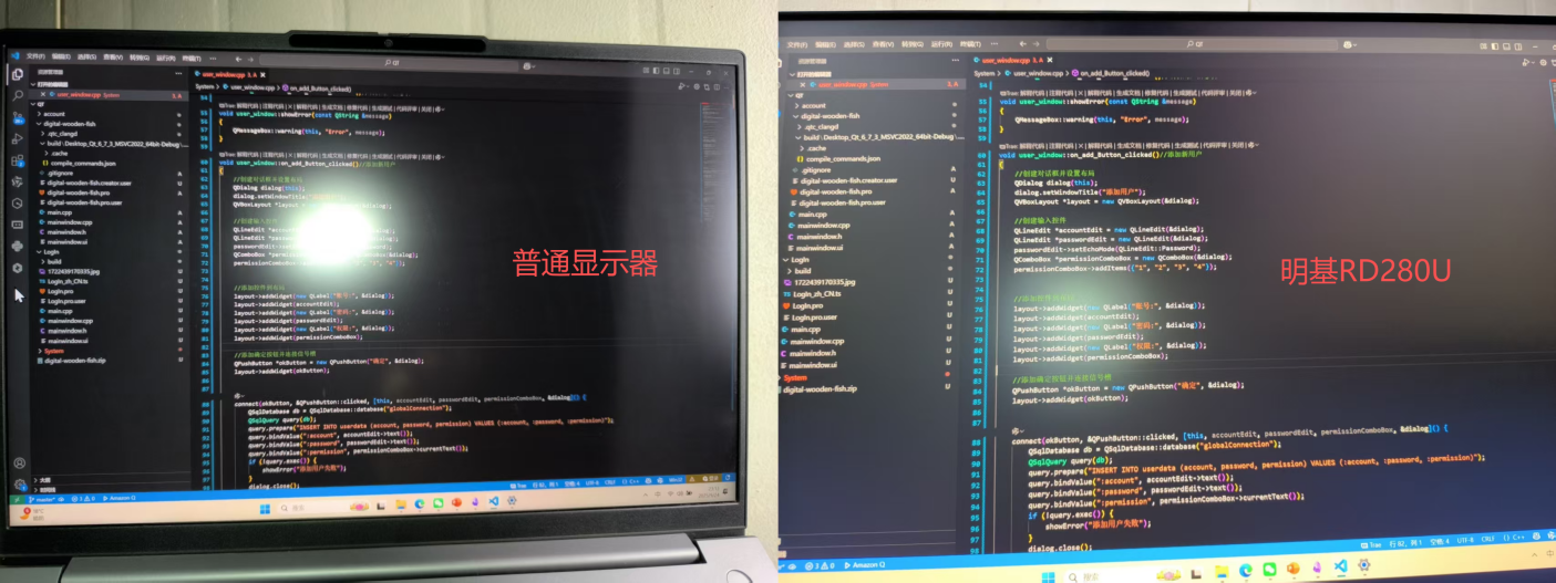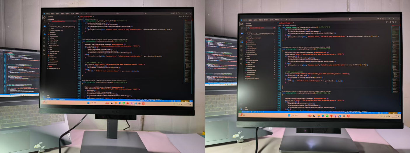 28 寸 3:2 的屏幕比例(3840×2560),简直是为多窗口编程量身定做。之前用 16:9 显示器写 代码,相同习惯下,只能显示 48行代码;换成 RD280U,同样的窗口大小能显示 67 行,不用反复上下找变量定义,思路连贯得像开了「代码续杯」。下面这张图,左侧是市面最常见的显示器,右侧是明基RD280U编程显示器,可以看到,一次显示代码增加了40%