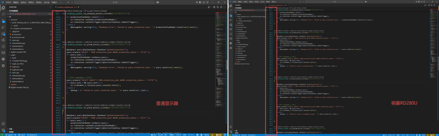 左侧为普通显示器,右侧为明基RD280U编程显示器,可以明显看到明基显示器对于代码色彩对比高、高亮做的更加友好