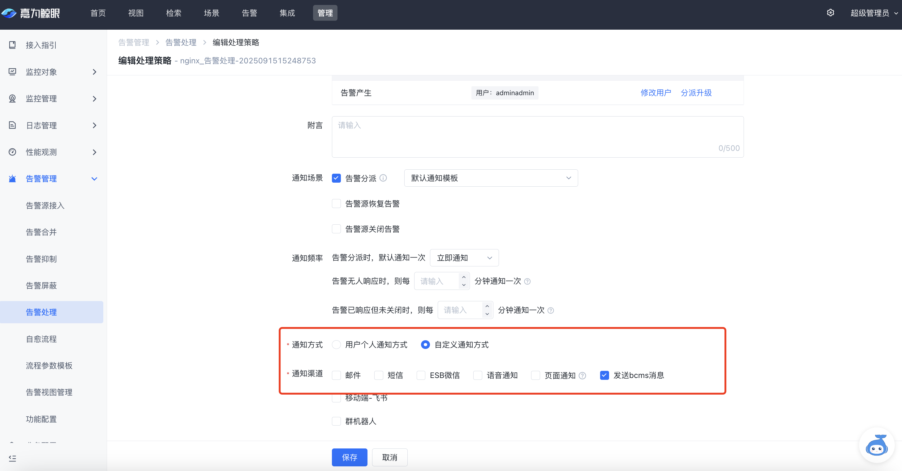 告警事件可配置化接入:对接嘉为蓝鲸告警中心,通过告警策略配置中的消息通知渠道,将疑似应急事件的告警主动推送到应急事件管理。