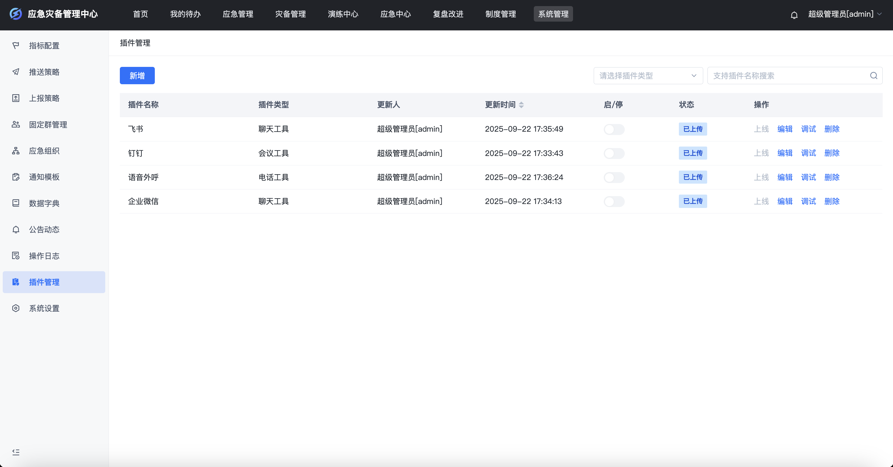 实现外部接口通过插件的方式进行统一接入与管理,便于同类型接口替换时只需上传对应插件包即可正常使用。比如IM工具的对接,对于不同的客户,聊天工具的选择分别对应企微、飞书或钉钉,那么用户只需要替换对应的插件包上传、调试成功后即可正常使用,大幅提升了产品的可扩展性,并实现快速交付。