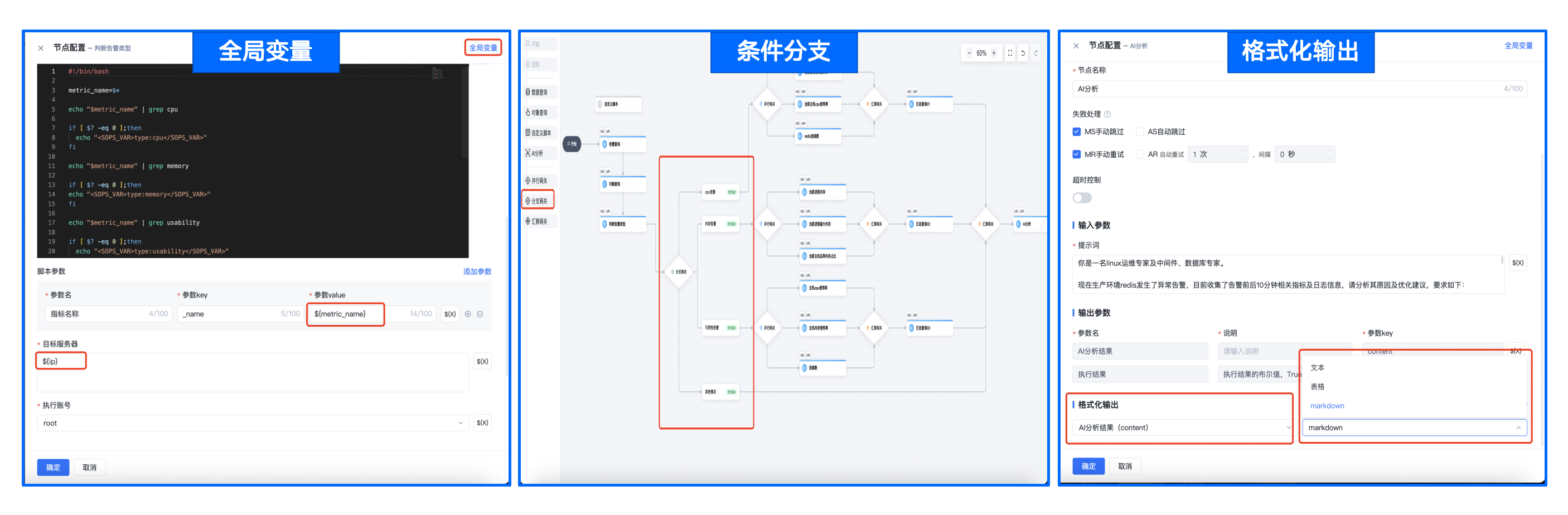 支持全局变量、条件分支和格式化输出:支持全局变量与上下文传参,支持条件分支判断,保证最小化的输入与精细化的条件分支决策;支持输出参数的格式化输出,包括文本、表格、markdown三种格式,保证输出数据的可读性。