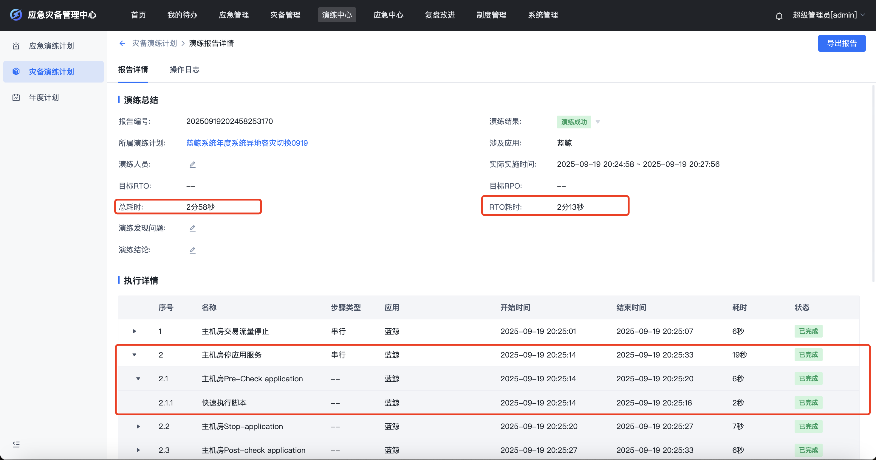 演练报告展示切换执行流程多层级、精细化的耗时统计:支持流程步骤、节点、子节点的耗时统计,支持总耗时和RTO耗时统计,支持部分步骤耗时不计入RTO耗时统计。