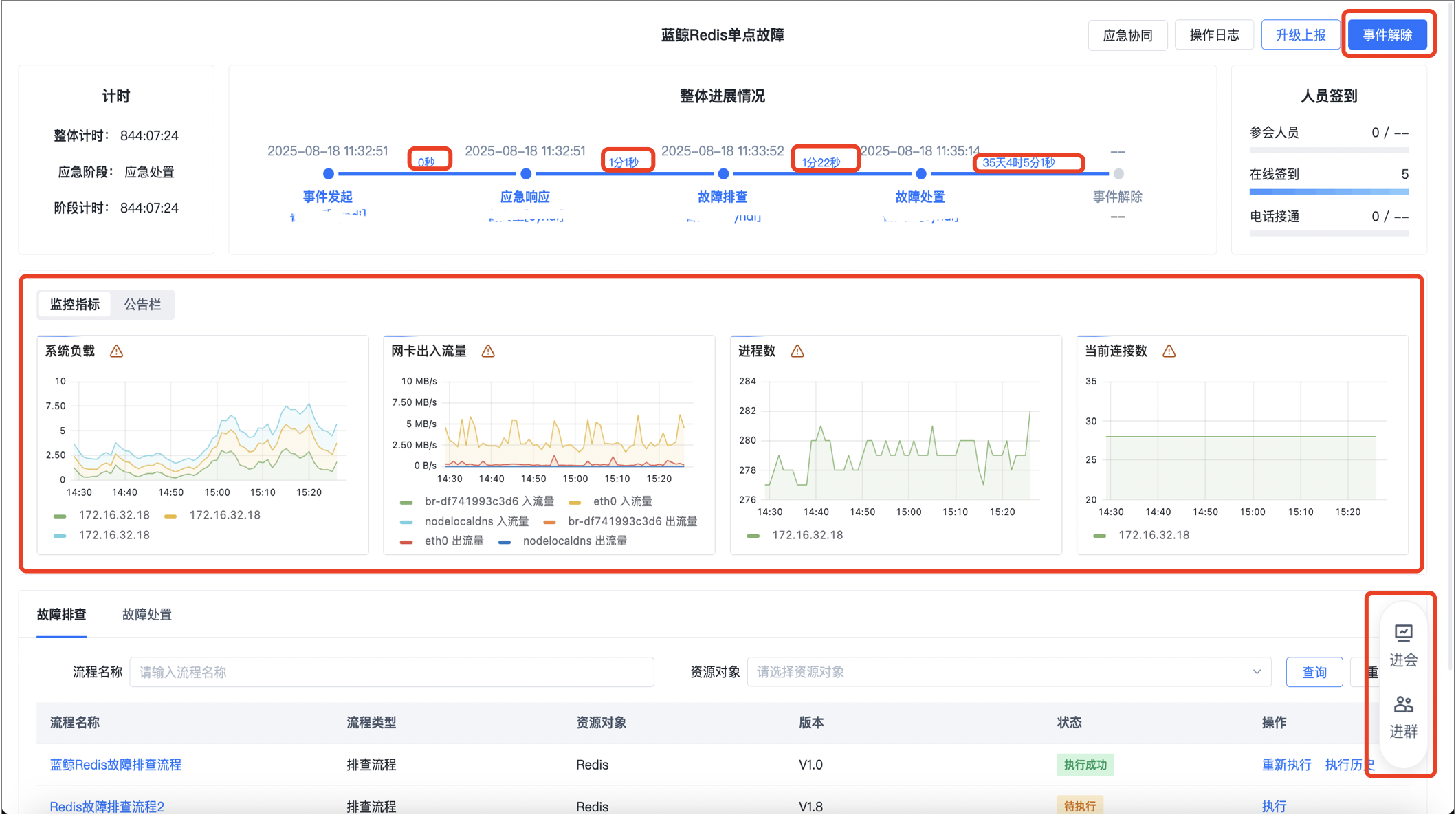 业务指标观测、阶段计时、主动进群进会、自动生成ITSM故障单:丰富和完善应急事中能力,包括业务指标观测、应急各阶段计时、一键建群拉会之后的主动进群进会、事件解除时自动创建ITSM故障单等功能,提供一站式应急服务。