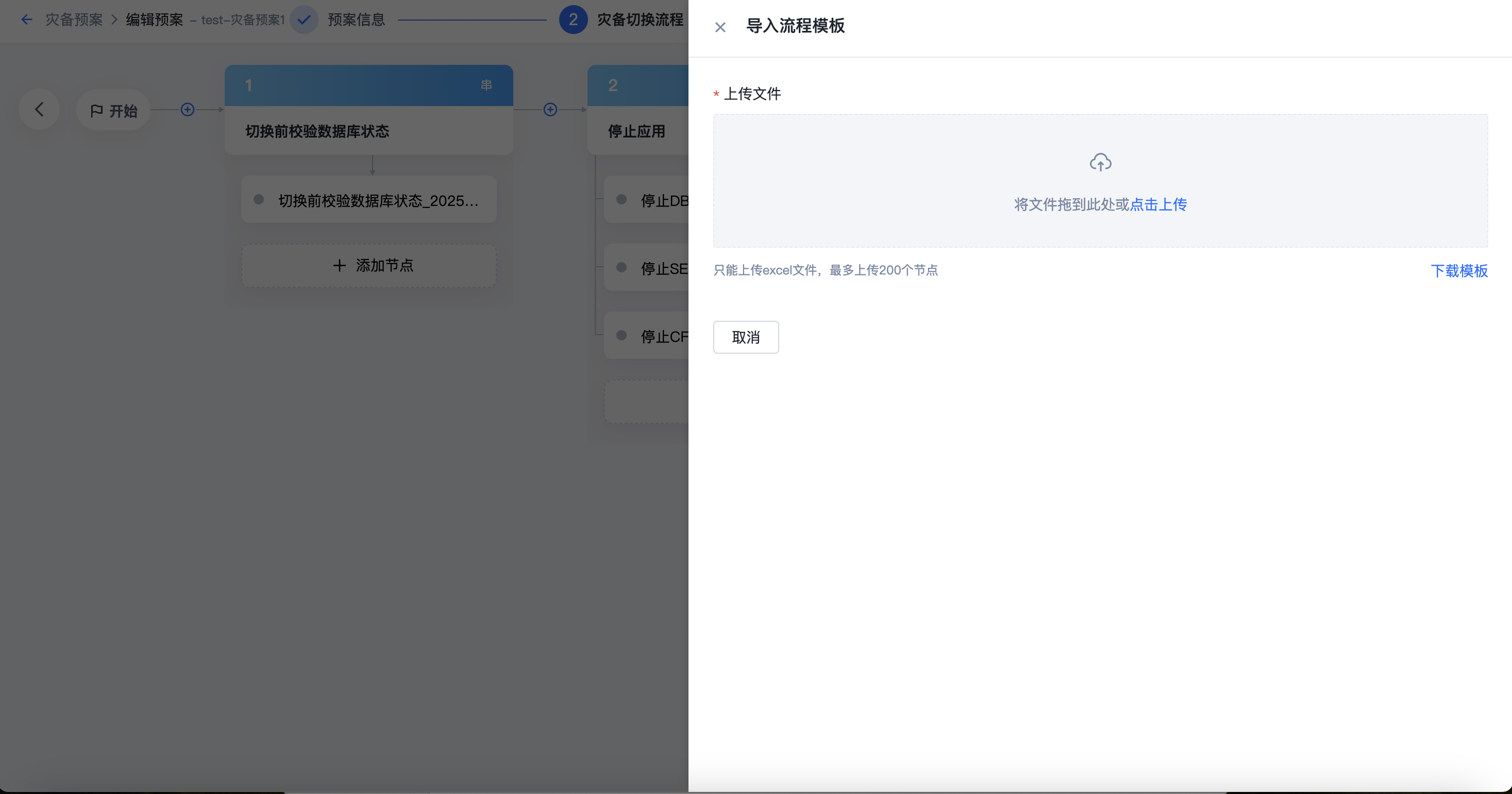 灾切流程一键式导入:支持通过excel流程模板导入自动生成系统切换流程,简化用户操作,提升用户使用体验。