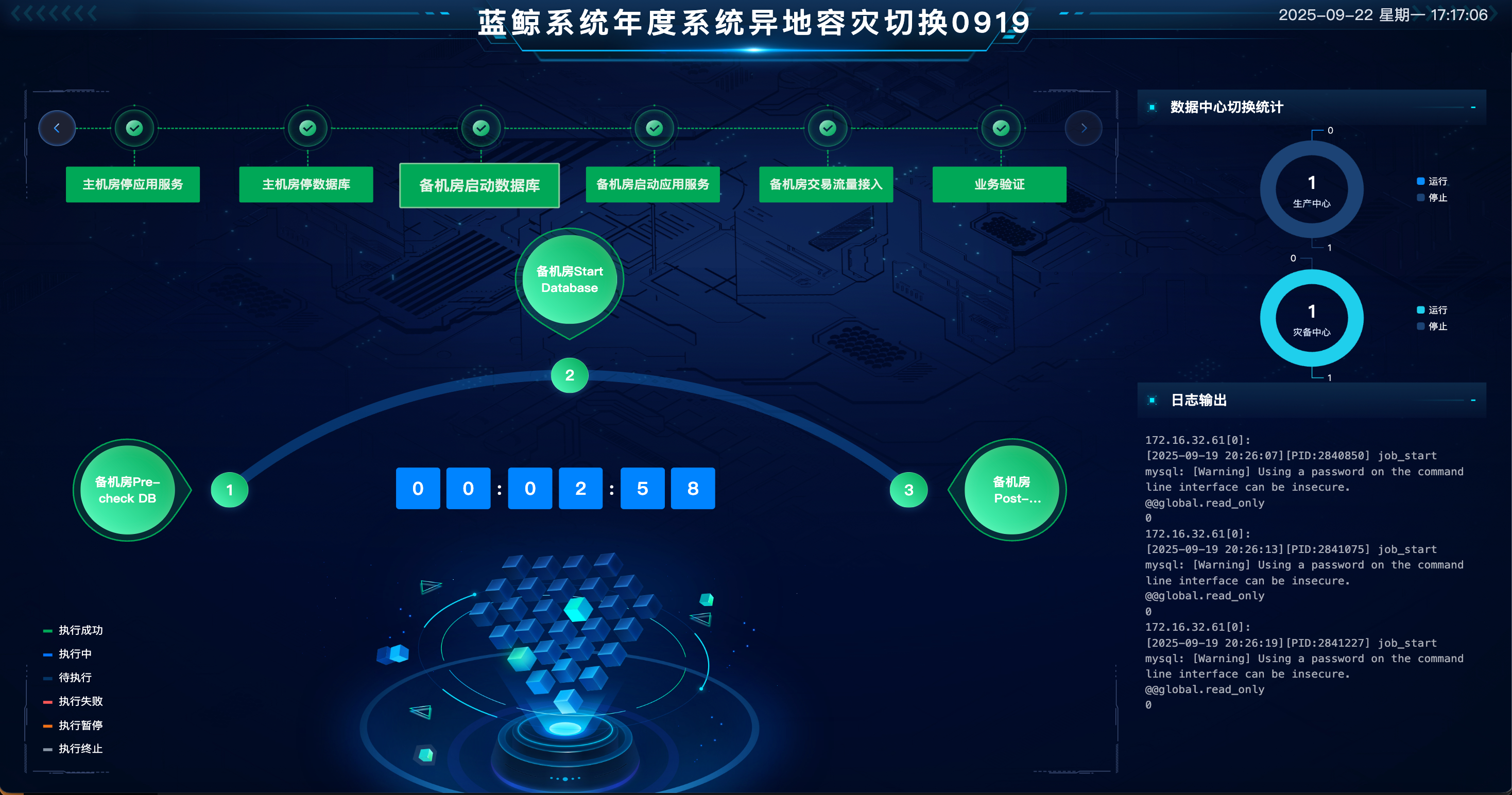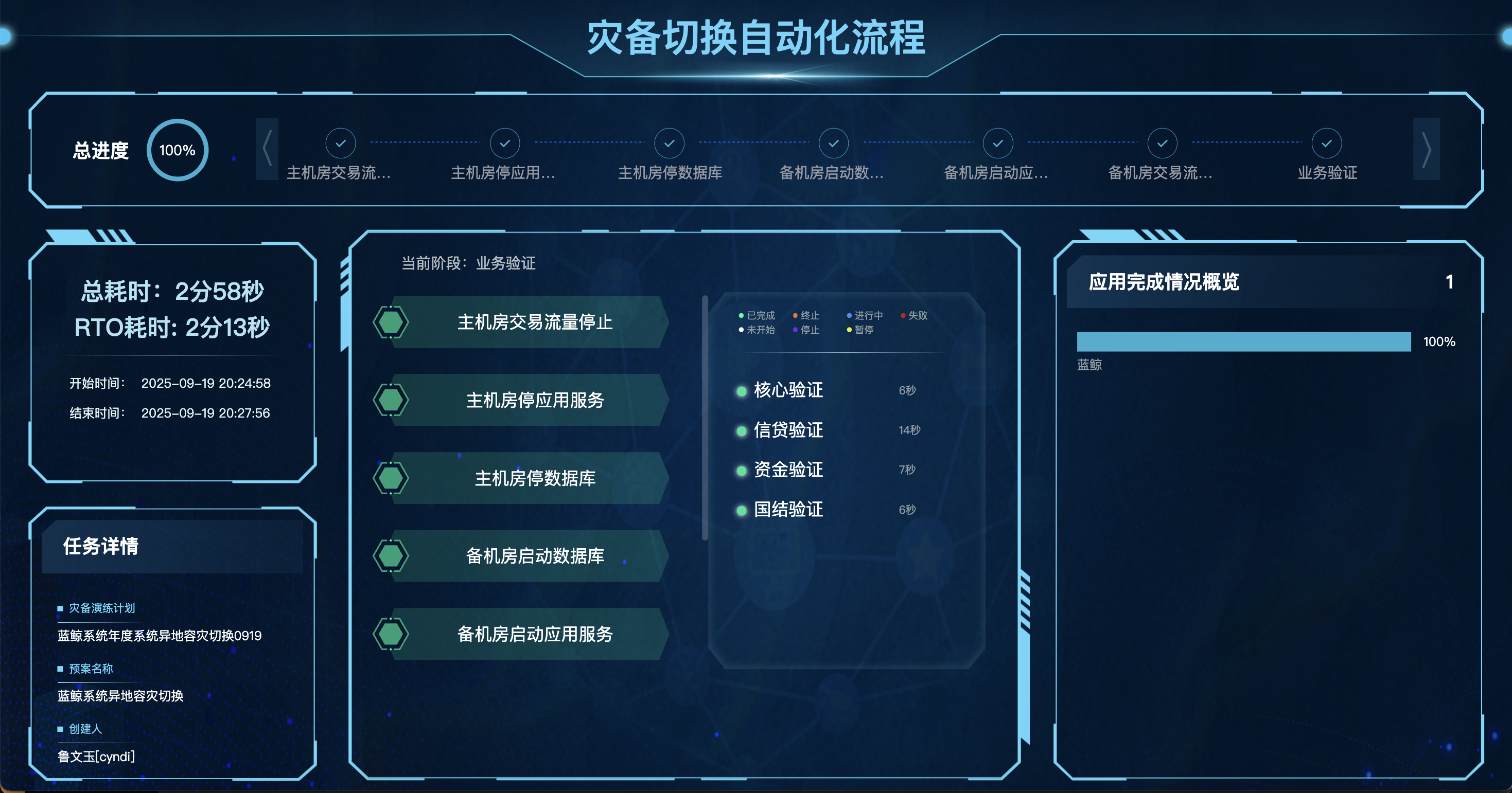 支持丰富的大屏展示:默认支持两块灾备演练大屏的展示,可动态展示各步骤、节点的切换执行展示,耗时统计、应用切换进度统计、日志输出等。