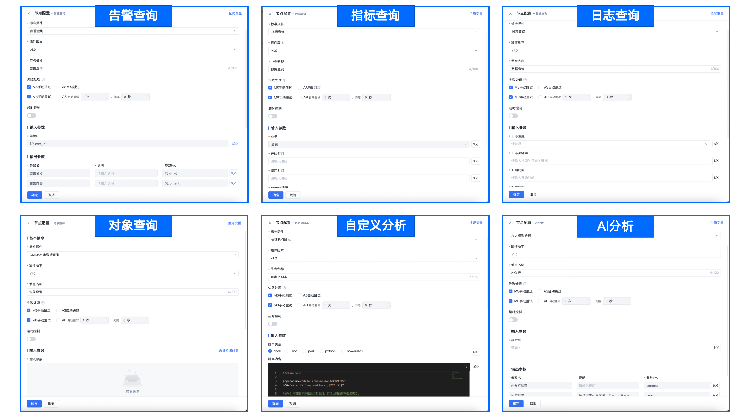 内置丰富排查定位插件,支持可配置化扩展:内置告警数据查询、监控指标查询、日志数据查询、CMDB对象数据查询、数据统计分析、AI智能分析等插件,并可根据客户实际需求进行原子插件开发和可配置化扩展。