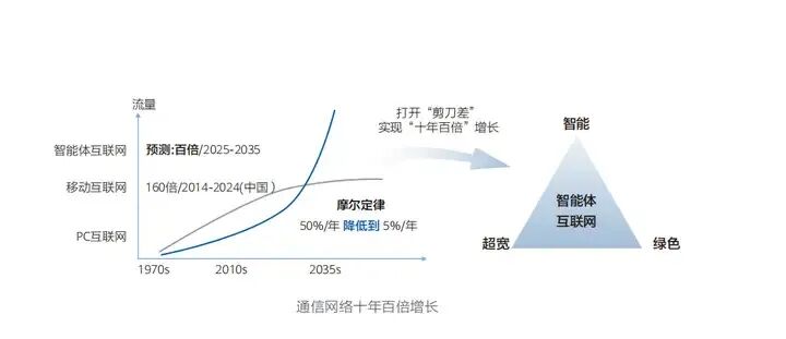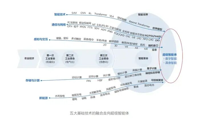 5. 移动互联进化 | 从 App 生态→多 Agent 协同,交互界面升级为 SMUI(空间多模态),生态本质 “服务找人” | 90 亿人拥有 9000 亿智能体,通信容量增 100 倍,端云协同实现低时延(<1ms)、高隐私 |