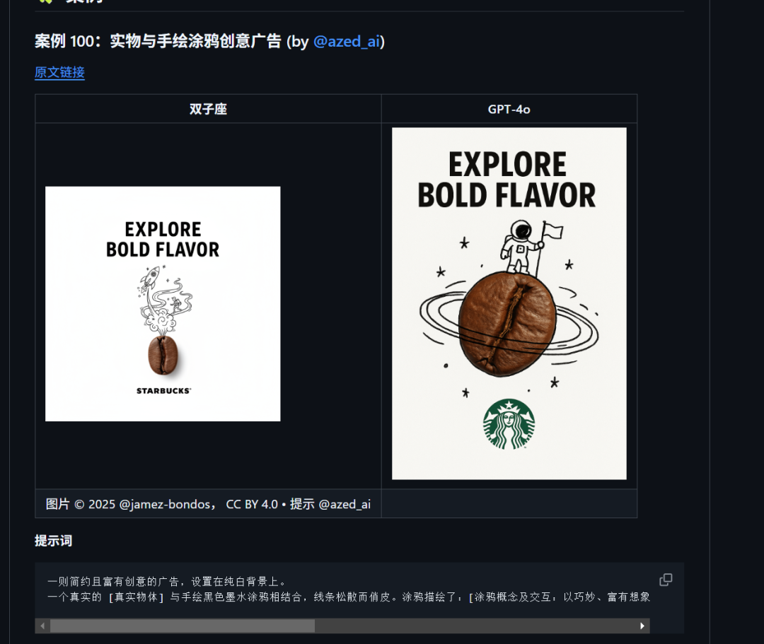 其实你会发现。nano-banana比4o做得更好。倒也可以快速对比一下,挑选有趣的nano-banana案列,当然这个仓库打都使用的是4o以前的案例。nano-banana这个模型有一些独特的案列没集成进去。