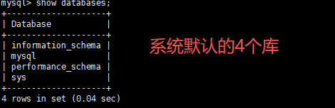 如果你未创建库的情况就会看到MYSQL默认的4个库,这些库后面我们单独讲解。