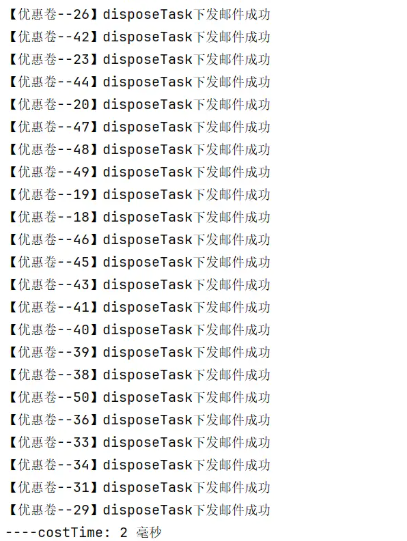 通过上述设计和实现,系统能够高效地处理批量优惠券下发任务,利用线程池并发执行任务,显著提升了任务处理速度和系统吞吐量,接下来启动程序,查看最后耗时情况: