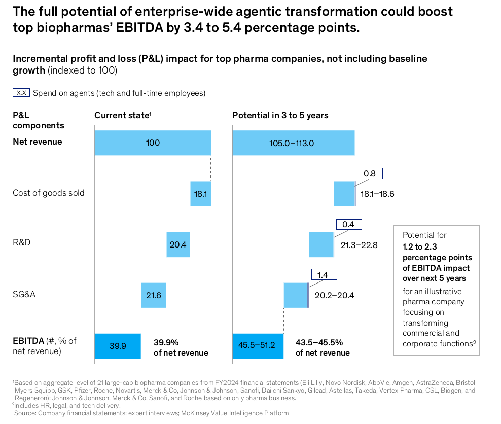 智能体AI同样是强大的成本控制工具,预计将使制药企业的EBITDA(息税折旧及摊销前利润)提升3.4至5.4个百分点,医疗科技企业的EBITDA提升2.2至4.7个百分点。