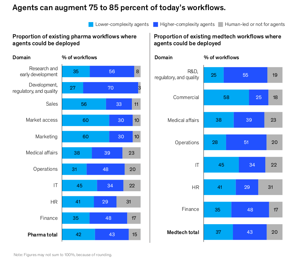 智能体AI最直接的影响体现在对工作流程的改造上。分析显示,无论是制药(pharma)还是医疗科技(medtech)领域,都有巨量的现有工作可以被“智能体化”(Agentifiable)。