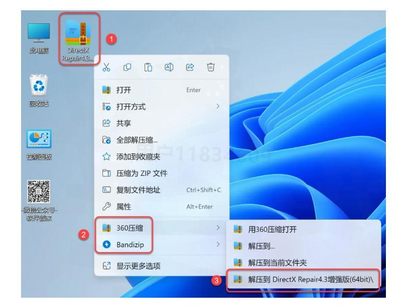 ①解压DirectX Repair安装包: - 鼠标右击【DirectX Repair V4.3增强版(64bit)】压缩包 - 选择电脑上安装的解压软件(如:360压缩、WinRAR等) - 点击【解压到DirectX Repair V4.3增强版(64bit)】