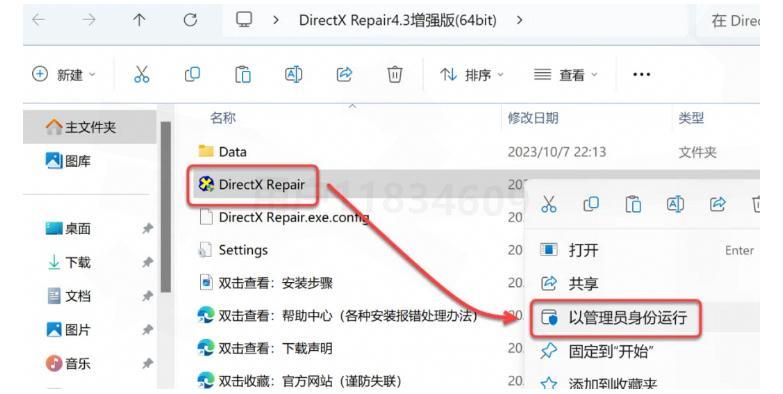 ②打开程序: - 进入解压后的文件夹 - 找到【DirectX Repair V4.3增强版(64bit)】主程序 - 鼠标右击选择【以管理员身份运行】(这步很重要,否则可能无法正常修复系统文件)