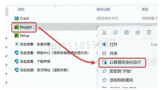 ①找到解压出来的【Keygen】文件 ②鼠标右键点击它 ③选择【以管理员身份运行】