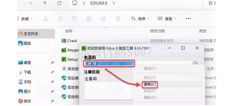 ①点击【安装】按钮 ②等待系统生成机器码 ③机器码出现后,用鼠标全选所有的机器码 ④鼠标右键选择【复制】