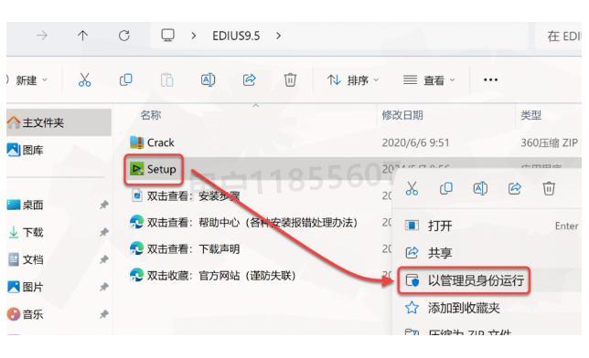 ①回到【EDIUS9.5】文件夹 ②找到【Crack】压缩包 ③鼠标右键点击它 ④选择你的解压软件(比如360压缩) ⑤点击【解压到当前文件夹】