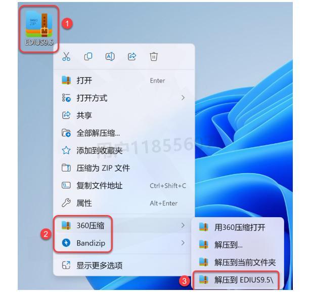 ①找到下载好的【EDIUS9.5】压缩包 ②鼠标右键点击一下 ③选择你电脑上的解压软件(一般是360压缩或者WinRAR) ④点击【解压到EDIUS9.5】
