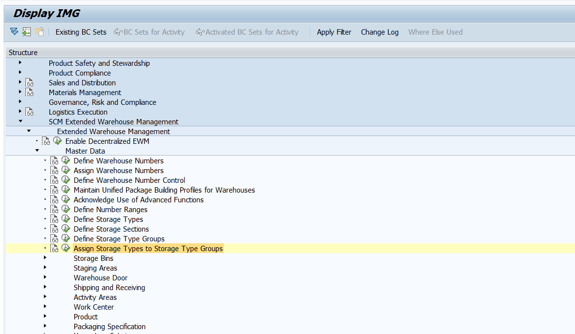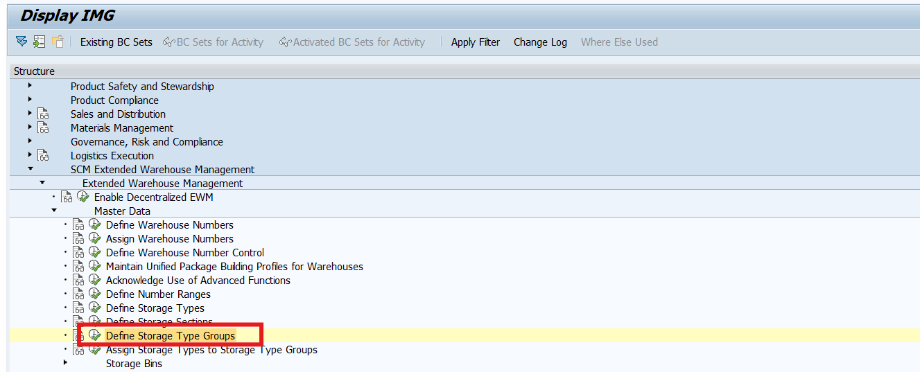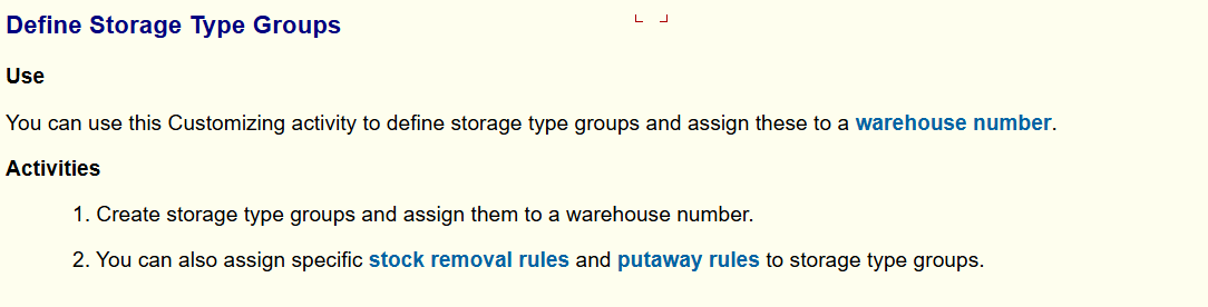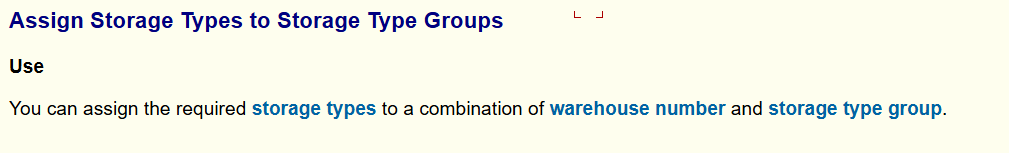 You can use this Customizing activity to define storage type groups and assign these to a warehouse number.