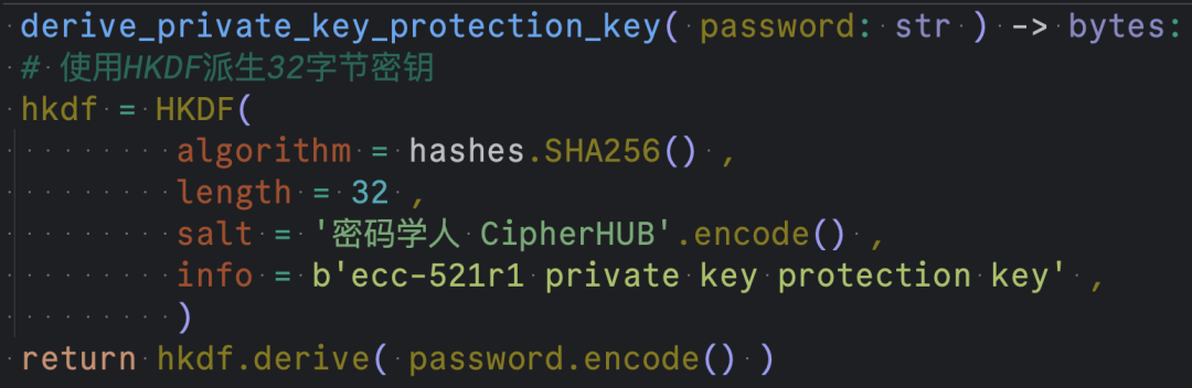 用户口令不直接用于加密,而是通过HKDF派生专用保护密钥:
