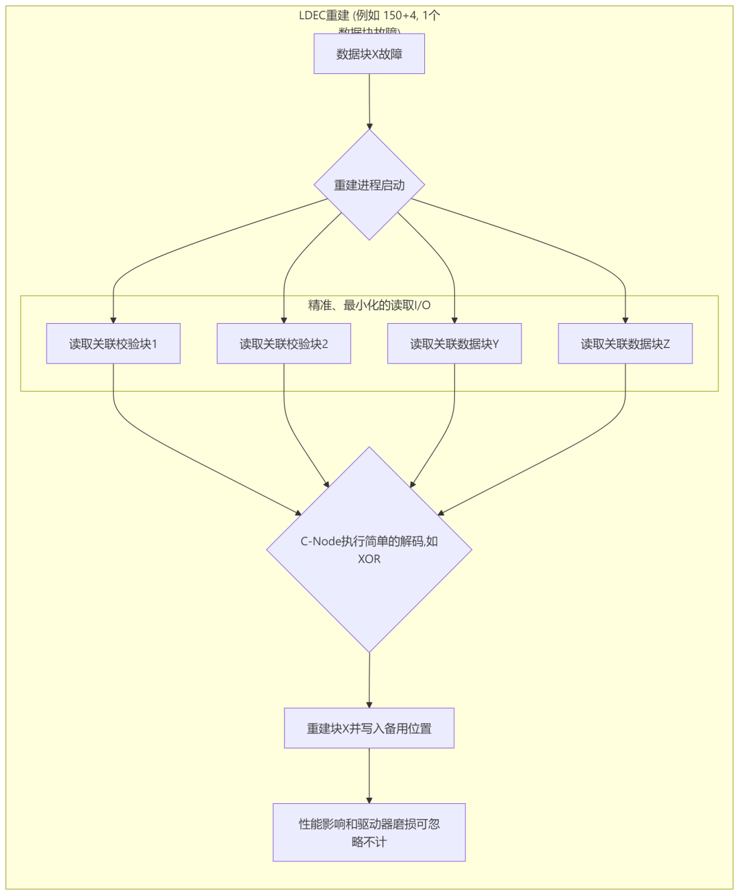重建机制 | 全局解码:重建1个故障块,必须读取条带中所有$k$个幸存的数据块。 | 本地解码:重建1个故障块,仅需读取一个预先确定的、由少量数据块和校验块组成的微小子集。 | 从根本上将数据恢复的I/O模式从“暴力”读取转变为“外科手术式”的精准操作。 |