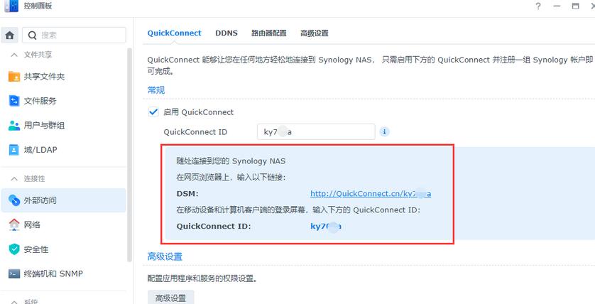 自带外网地址的:另部分NAS型号本身有自带内网穿透的,则可以直接使用其对应NAS后台的提供的公网地址进行访问也可以。部分NAS设备(如群晖)自带内网穿透功能,主要通过QuickConnect服务方式实现:Synology官方提供QuickConnect服务,无需额外配置即可实现远程访问。只需在NAS控制面板中启用该功能,通过生成的动态域名即可从外部网络访问设备。