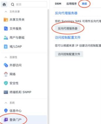 NAS反向代理设置:打开NAS的控制面板,在“登录门户”的“高级”页面里点击打开“反向代理服务器”,新增两项反向代理服务。