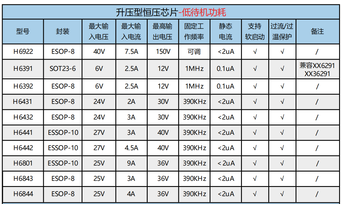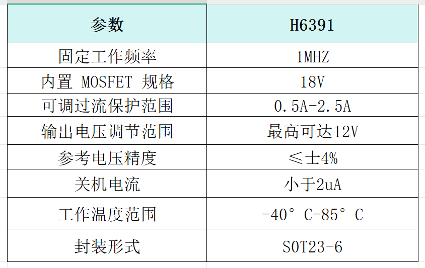 H6391 作为一款高性能异步内置 MOS 管升压恒压芯片,具备高效能、高精度与多重保护机制等核心优势,高度契合低功耗场景下的电压转换需求,其关键技术参数与特性如下: