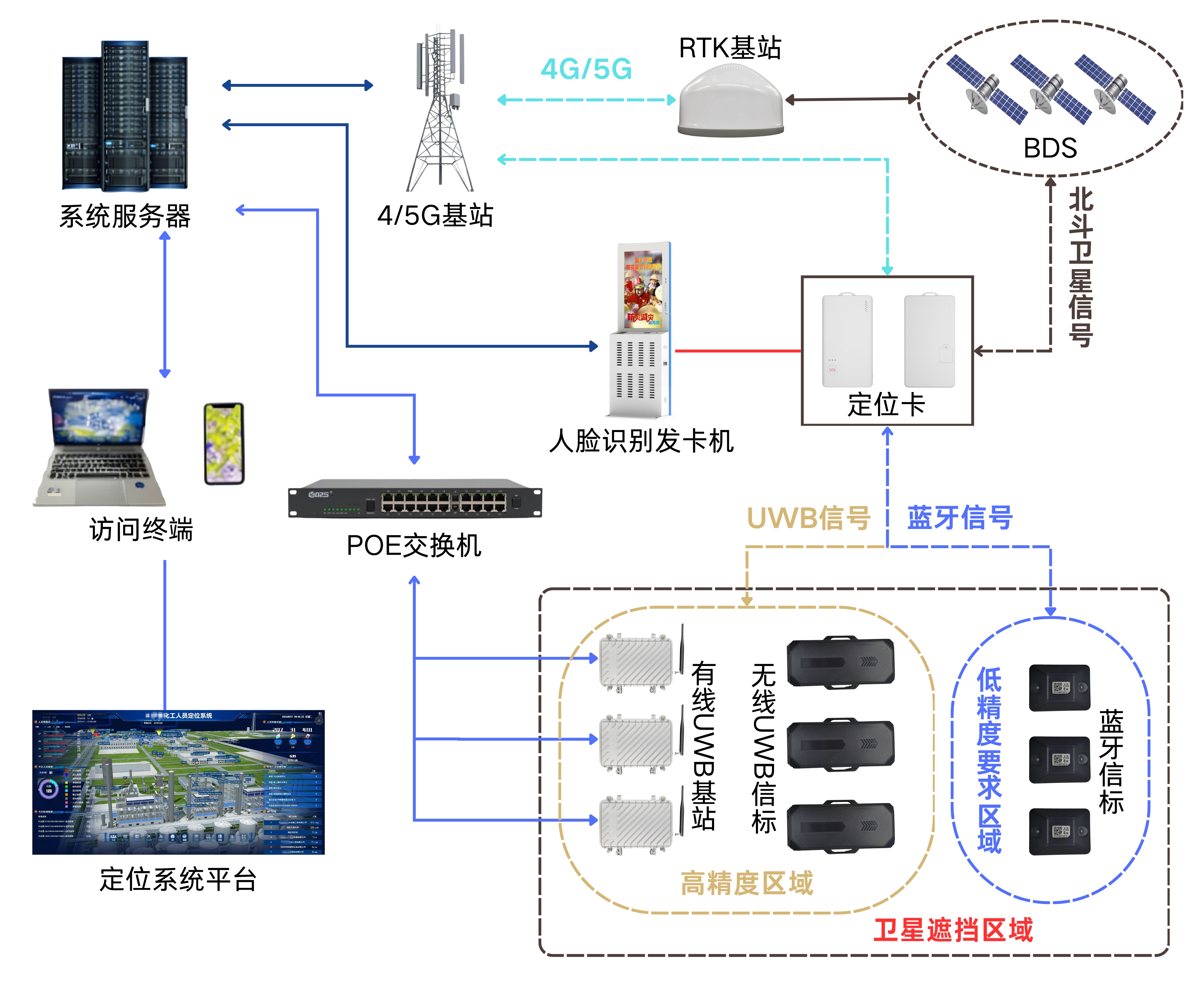 通过融合北斗RTK、蓝牙、UWB以及4G等多种定位技术,无论在石油化工厂的室外开阔区域,还是设备密集、信号复杂的室内环境,系统都能实现对人员位置的实时、精准捕捉,并将人员位置信息直观地呈现在电子地图上,方便管理人员随时掌握厂内人员动态分布情况。