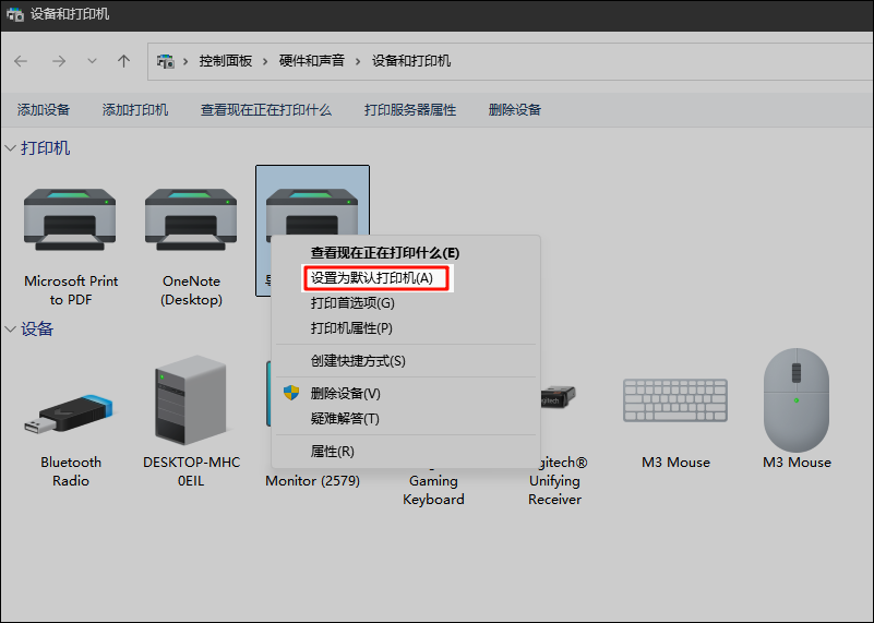 如果电脑连了多个打印机,系统可能默认打到别的设备上。右键我们真正想用的那台,选“设为默认打印机”,这样以后打印就会自动选它。