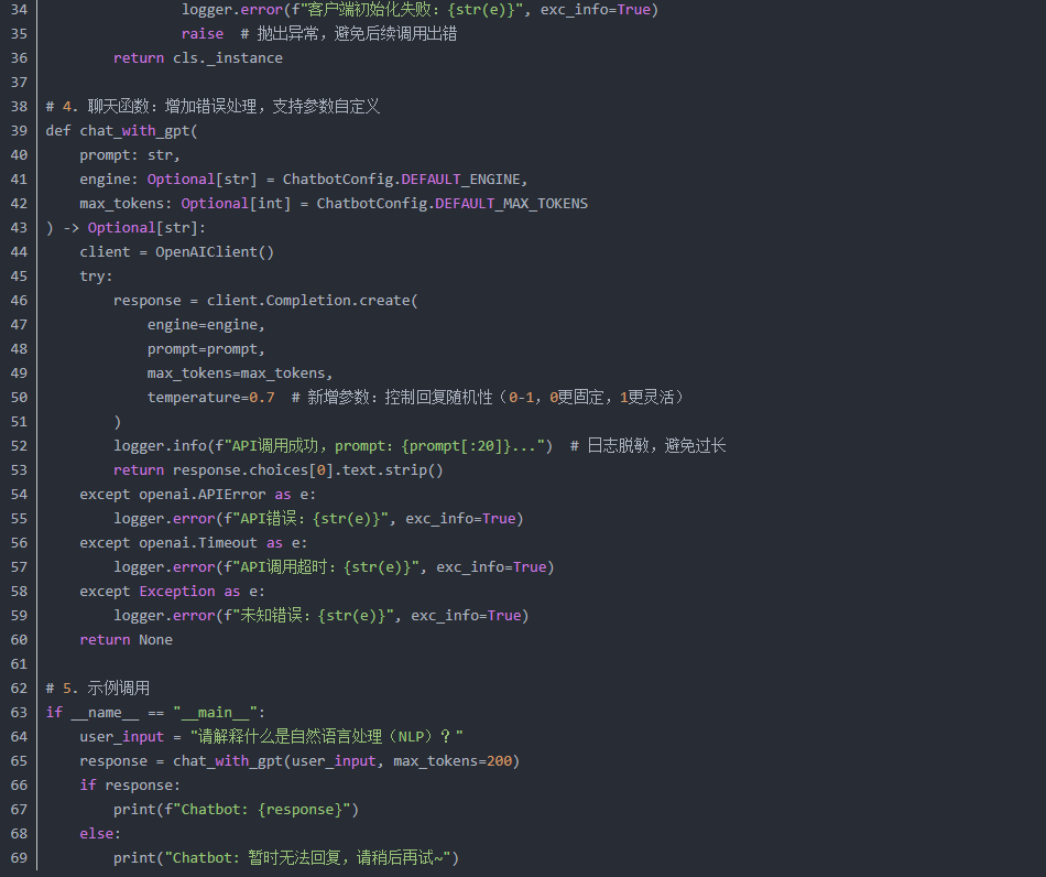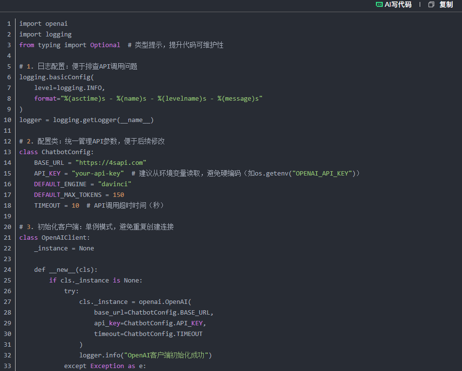 配置解耦:通过ChatbotConfig类管理参数,后续修改base_url或max_tokens时,无需改动业务逻辑;