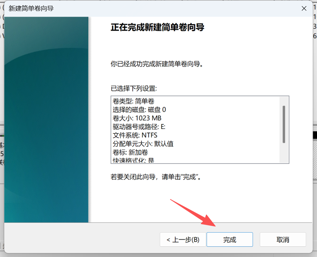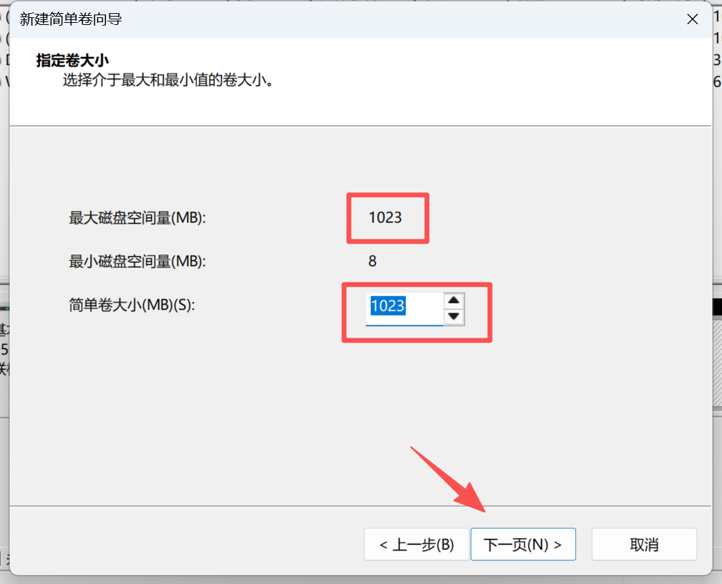 这里就是我上面提到的,现在是把这个未分配券,分配成多个,还是就分配成一个,分配成一个的话,就和最大磁盘空间量保持一致,如果是多个,就根据自己情况来操作。这里我分配成一个,并点击下一步