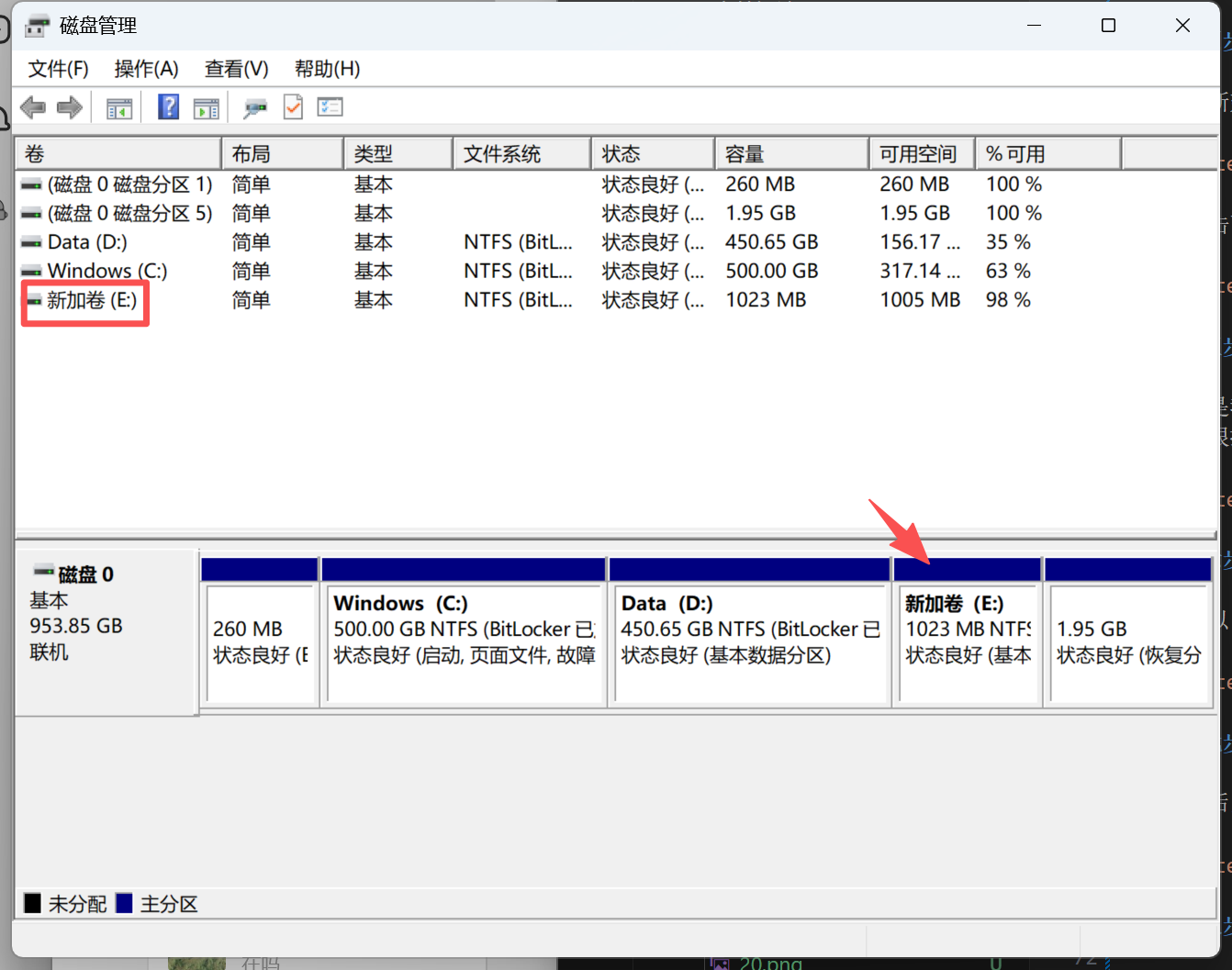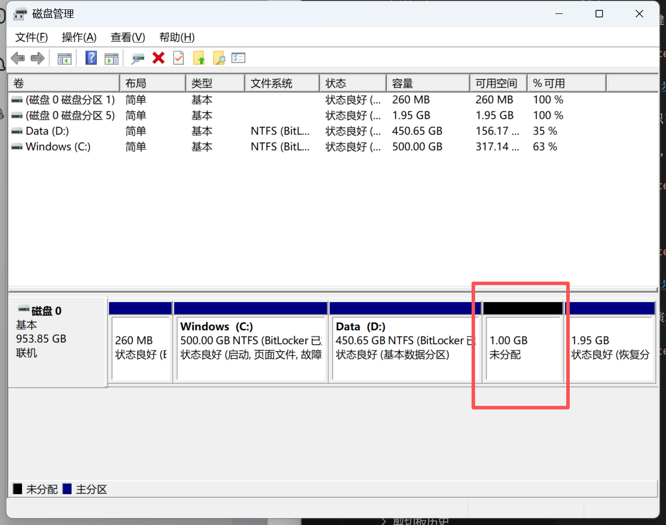 压缩后会出现一个未分配的,这时候他又显示成GB了。