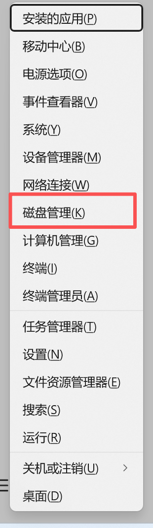按快捷键【wins+X】的组合键(或者右键点击windows图标),在弹出的选项中选择【磁盘管理】选项;如下图: