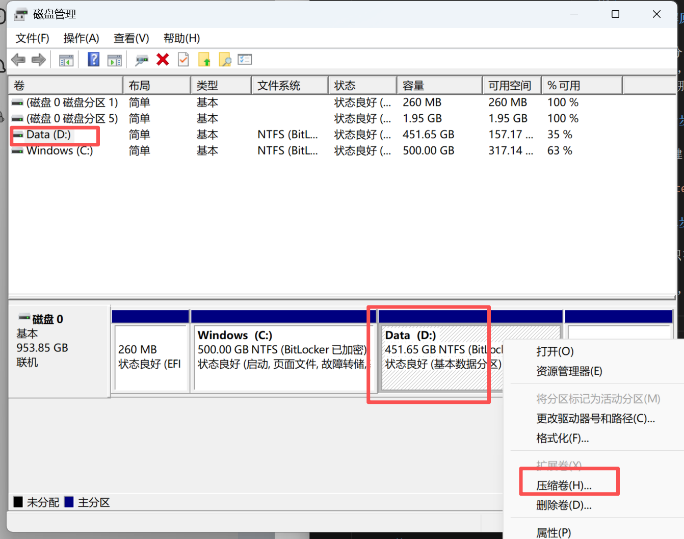 选择D盘,并点击右键,再出现的下拉选项中选择【压缩卷选项】,如下图: