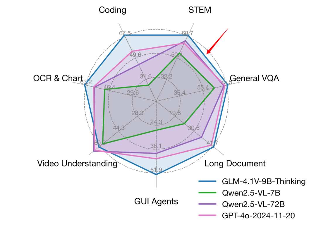 从这个能力雷达图可以看出,GLM-4.1V-9B-Thinking虽然只有9B参数,但综合能力领先许多同类模型,尤其在OCR & Chart、GUI Agents、Coding这几项能力上表现突出。