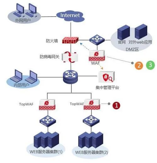 部署逻辑:串联在 Web 服务器前端,需满足高硬件性能要求,且必须具备 HA(高可用性)、Bypass 功能,同时需与负载均衡、Web Cache 等前端设备协同部署。