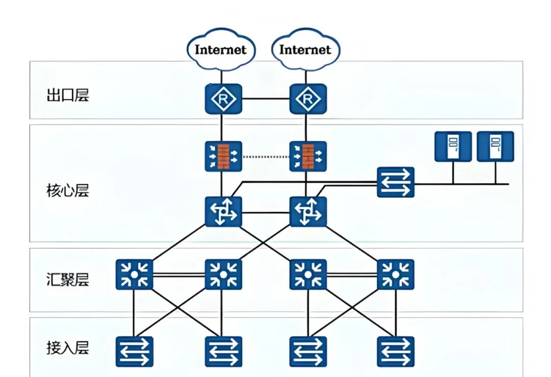 汇聚层 | 1、汇聚接入层交换机的流量2、在不同VLAN或子网间进行路由(三层交换)3、实施安全策略(访问控制列表ACL)4、服务质量(QoS)标记和策略应用 | 较高的转发性能支持三层路由功能冗余设计通常使用三层交换机 |