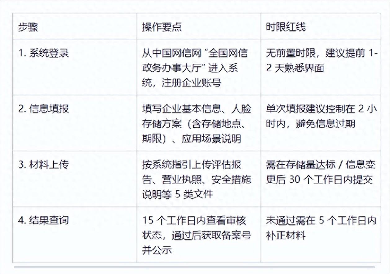 备案采用线上办理,依托国家网信办 “个人信息保护业务系统”(https://grxxbh.cacdtsc.cn),核心流程分四步,实操周期远短于法定时限: