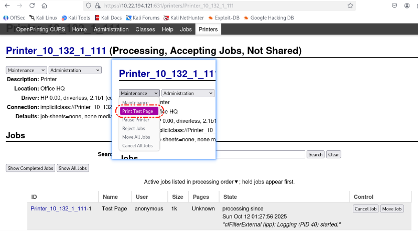 访问靶机的631端口的打印机列表,可以看到之前通过运行poc.py