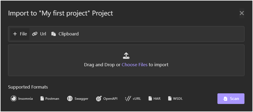 Insomnia支持导入和导出功能。目前支持的导入格式包括Insomnia、Postman v2.0和v2.1、HAR、OpenAPI(3.0、3.1版本)、Swagger、WSDL以及cURL。