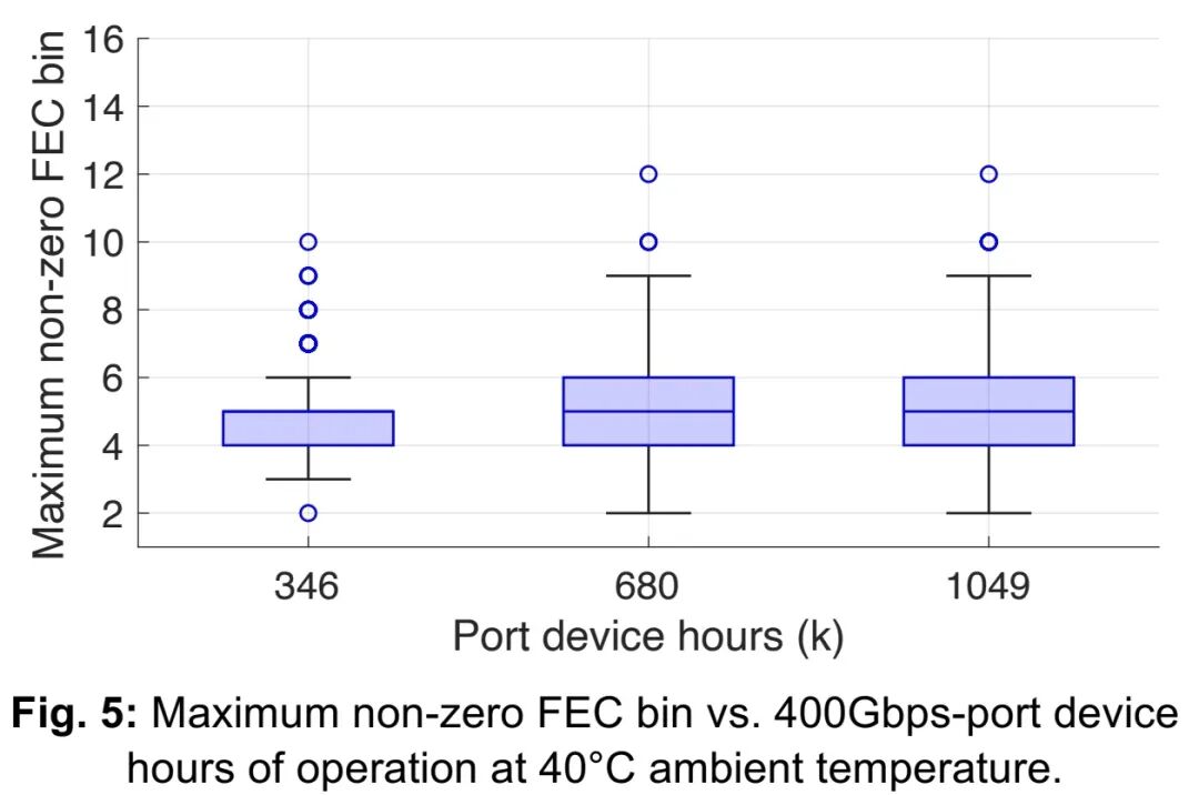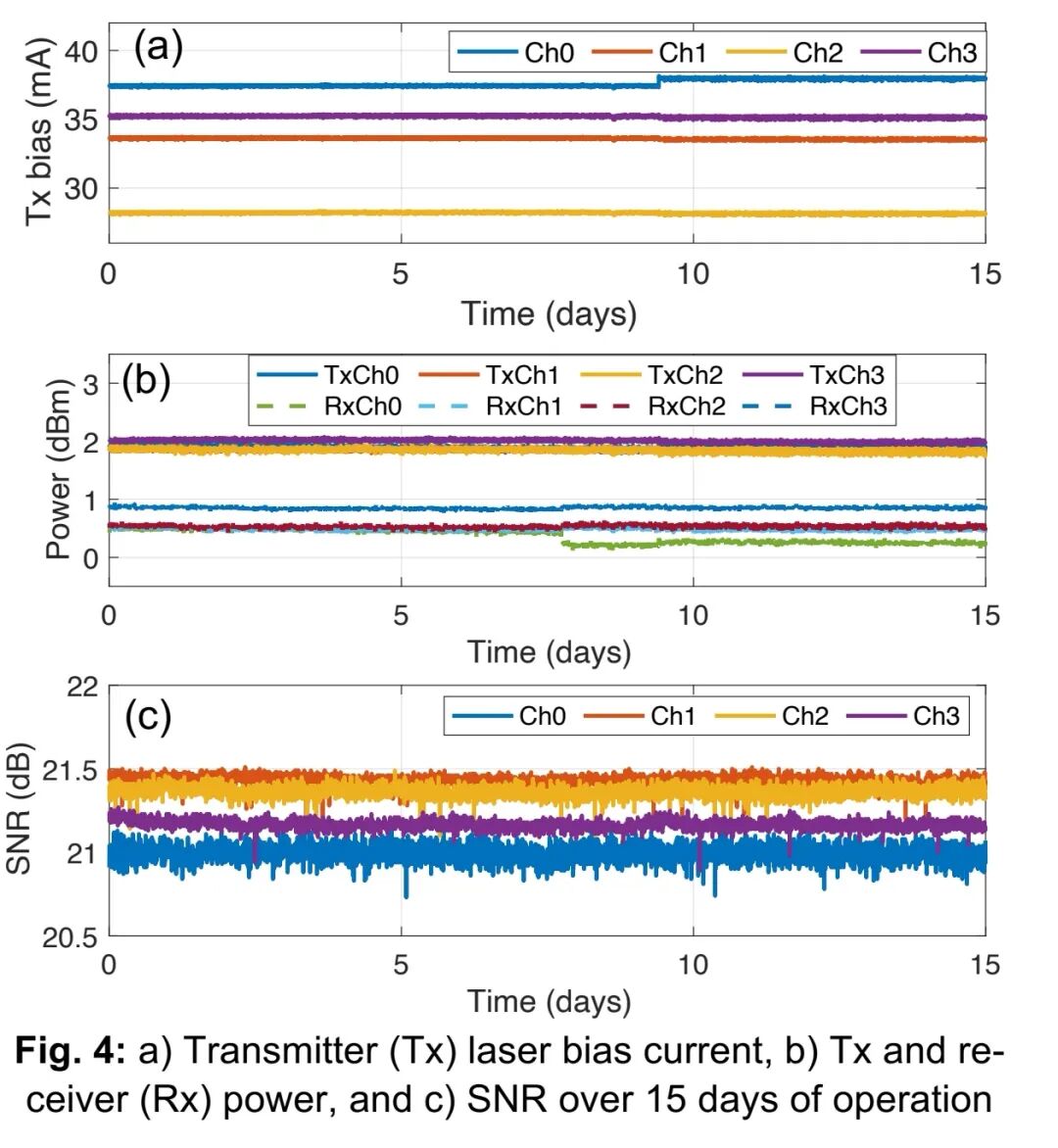 传统可插拔光模块故障可现场更换,但CPO中光学部件不可现场更换,因此长期可靠性至关重要。Meta搭建大规模CPO交换机测试基础设施,在40℃应力环境下持续监测设备运行情况。图4(a)、(b)、(c)分别展示了随机选取的一台CPO设备的一个端口,在15天运行期间的每通道发射激光偏置电流、发射与接收功率,以及信噪比(SNR)数据。链路参数随时间变化的稳定性,是大规模减少链路故障的必要条件。