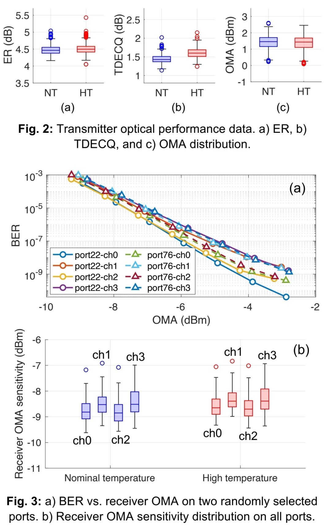 在发射机侧,测试消光比ER、发射机TDECQ、光调制幅度OMA等指标,结果表明在标称温度(NT)和高温(HT)环境下,这些指标均满足400GBASE-FR4标准规范。图3(a)展示了随机选取的CPO设备2个端口的所有通道上,误码率(BER)与接收OMA的关系。测试选用一款400Gbps FR4可插拔光模块作为参考发射机,4个通道的TDECQ约为2dB,ER约为5dB。图3(b)展示了CPO设备512个通道在BER为2.4×10⁻⁴时的接收OMA灵敏度统计分布。需说明的是,所有通道的BER均低于5×10⁻⁸,性能一致性良好,充分验证了CPO与现有光模块生态的互操作性。